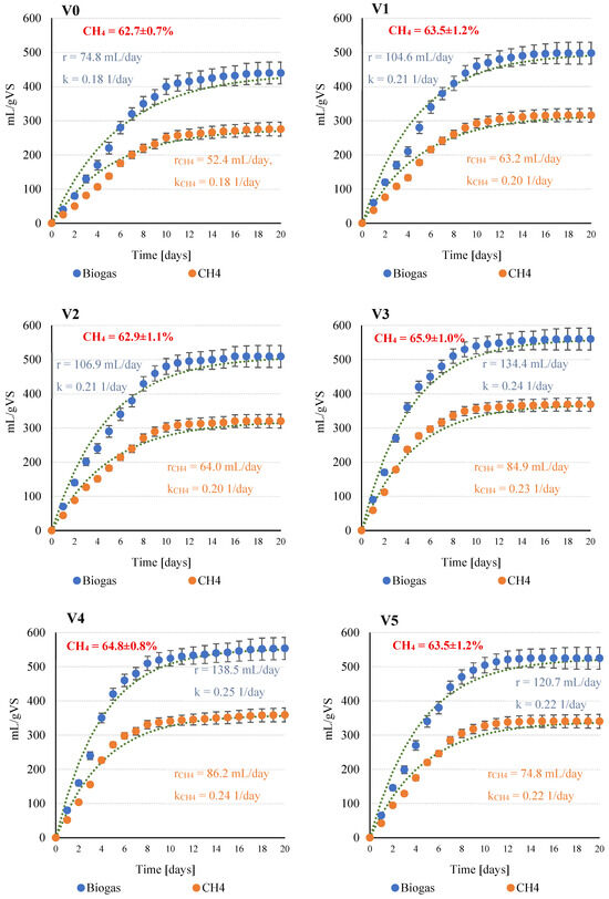 The course of anaerobic digestion (AD) in the experimental variants and the corresponding kinetic model curves are shown in Figure 2. The control variant (V0), without SCO2 pretreatment, exhibited the lowest biogas and methane yields, with biogas production of 440 ± 32 mL/g VS (r = 74.8 mL/day, k = 0.18 1/day) and methane production of 276 ± 20 mL CH4/g VS (rCH4 = 52.4 mL CH4/day, kCH4 = 0.18 1/day). Introduction of SCO2 in V1 significantly (p ≤ 0.05) increased biogas and methane yields to 498 ± 33 mL/g VS and 316 ± 21 mL CH4/gVS, respectively, with improved kinetic parameters (kCH4 = 0.201 1/day, rCH4 = 63.2 mL CH4/day). In V2 (1:5 ratio), the upward trend continued, with biogas yield reaching 509 ± 20 mL/g VS and comparable kinetic parameters.