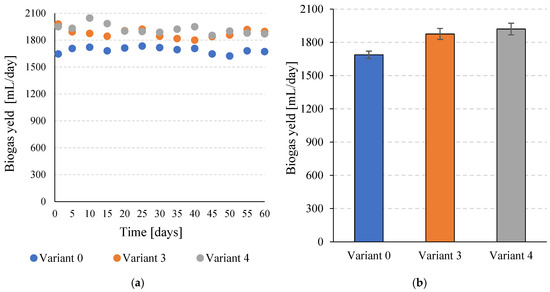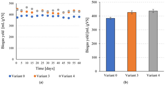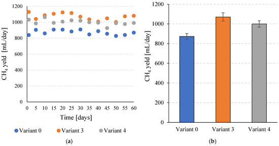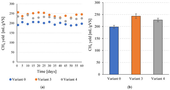 where —yield of biogas/CH4 produced in relation to the VS removed (L/kgVSremoved); Vb/CH4—volume of biogas/CH4 produced from the VS load fed into the reactor (L); SVSin—content of VS in the substrate (g/kg); SVSout—content of VS in the digested sludge (g/kg); Qin—volume of substrate fed into the reactor (L); Qout—daily volume of digested sludge discharged (L).