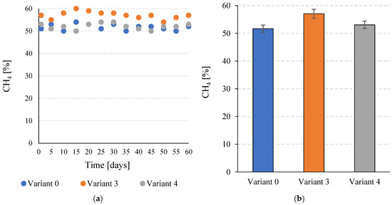 Analogous trends were observed under continuous fermentation, which, despite greater process complexity, better reflects real operating conditions. Variants V3 and V4, identified as optimal in batch experiments, were evaluated in continuous reactors. In both cases, absolute biomethane yields were lower than in batch fermentation, reflecting the operational constraints of continuous systems. Variant V3 achieved a significantly higher CH4 yield of 10.8 L/kg FM compared to 9.9 L/kg FM in V4 (p ≤ 0.05, Table 7). Correspondingly, the net energy gain was also higher for V3 (17.4 Wh) than V4 (8.3 Wh), with these differences being statistically significant (p < 0.05). These results confirm that, even in continuous systems, increasing the SCO2 dose above a ratio of 0.3 leads to decreased energy efficiency, consistent with the saturation effect observed in batch experiments. The evaluation of energy efficiency is therefore critical for assessing both the economic feasibility and sustainability of the process, particularly at an industrial scale [81].