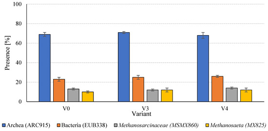Fluorescence in situ hybridisation (FISH) was used to identify the anaerobic microbial communities. Four molecular probes were used for the analysis: a universal probe for bacteria (EUB338) [32] and archaea (ARC915) [33] and two probes for specific methanogen groups—MSMX860 for Methanosarcinaceae and MX825 for Methanosaeta [34]. Observations were performed using an epifluorescence microscope (Nikon, Tokyo, Japan) equipped with a 100× objective and providing a total magnification of 1000×. The cell number of each microbial group was estimated from DAPI staining and quantitative analysis was performed using ImageJ (version 1.54f) software developed by the National Institutes of Health in collaboration with the Laboratory for Optical and Computational Instrumentation (LOCI) (University of Wisconsin, Madison, WI, USA) [35].