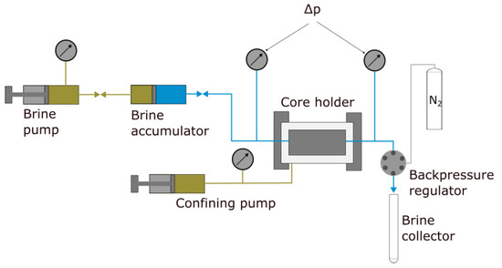 The flow tests were performed using DCI’s Core Flood System. The configuration of the set is shown in the diagram (Figure 2). Pressure monitoring was performed using pressure transducers (0–10,000 psi, accuracy: ±0.25% FS, ±25 psi or ±0.17 MPa). Flow rates were controlled by syringe pumps with a flow rate resolution of 0.1 µL/min and a dosing accuracy of ±1%, ensuring precise and stable fluid delivery. The tests were conducted at a constant temperature of 25 °C, applying a sealing pressure equal to the lithostatic pressure, and using system backpressure to maintain a pore pressure corresponding to the reservoir pressure. The experiments were designed to pump brine through the core at a constant flow rate until significant pressure changes were observed. The flow rates were selected to reflect the flow rate that would occur when injecting 150 m3/h of water into the reservoir zone at distances of 0.2 m, 0.4 m, 1 m and 4 m from the borehole wall.