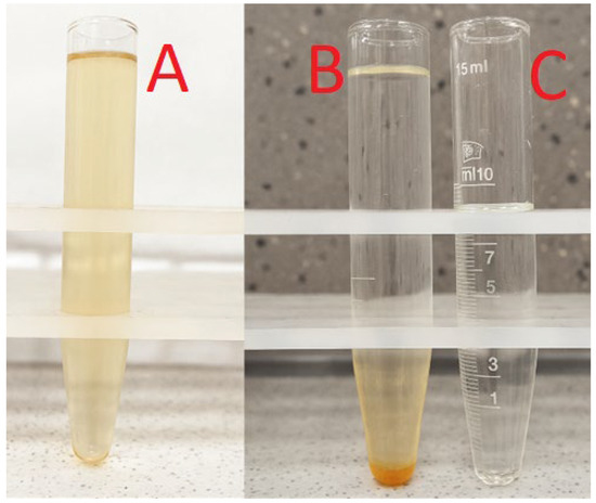 The mineralisation of the water was 15.04 g/dm3, while the pH measured 6.9, which represents a significant deviation from the in situ pH value of 5.8. The in situ brine contained iron at a concentration of 26.1 mg/dm3, whereas the brine used in the experiments had a considerably lower iron content of 2.71 mg/dm3. Similarly, the strontium content decreased from 82.5 mg/dm3 in the in situ brine to 74.2 mg/dm3 in the laboratory brine. Despite these reductions in iron and strontium concentrations, the major ions such as sodium, potassium, magnesium, and calcium showed no significant changes compared to the reservoir waters, indicating that their concentrations remained stable during sample preparation and handling. This suggests that while certain trace elements were reduced, likely due to oxidation or precipitation during storage and handling, the primary cationic composition of the brine maintained its representativeness of the in situ reservoir fluid. The brine was then decanted. This resulted in type A brine, which was straw-coloured. Next, part of the brine A was left for five weeks for further gravitational purification. After this time, the water was completely clear, while a small amount of ferrous sediment remained at the bottom. The decanted liquid was used in flow tests and designated as brine type B. The last type was brine type C (Figure 3). It was produced by filtering brine B through a rock core during flow tests. Microscopic observations did not reveal any particles larger than 1 µm in any of the brines, but it cannot be ruled out that such particles may have formed as a result of aggregation in later stages. The most important difference concerned the concentration of these particles.
