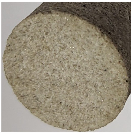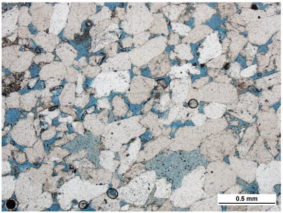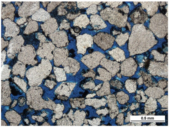 The Lower Jurassic sandstones used in the project are characterised by favourable reservoir properties. They are light grey, fine-grained rocks with moderately good grain sorting. According to the classification [34], they are sublitic arenites. The grain skeleton is composed of a predominant amount of moderately rounded quartz grains with a small amount of lithoclasts such as quartzites and detrital chlorites (up to 10% of the skeleton). Accessory muscovite flakes and feldspar fragments are present. The cement is composed mainly of clay minerals (kaolinite dominates), completely filling the pore space between the grains. It seems to fill mainly larger pores, often adjacent to each other. In addition, heavily degraded elements of the carbonate binder and neogenic quartz cement rims around larger grains are visible. The pores in the microscopic image are mainly larger free spaces separated from each other by narrow throats (channels). Their shape is mostly irregular, slightly elongated but without a clear directionality (Figure 4).