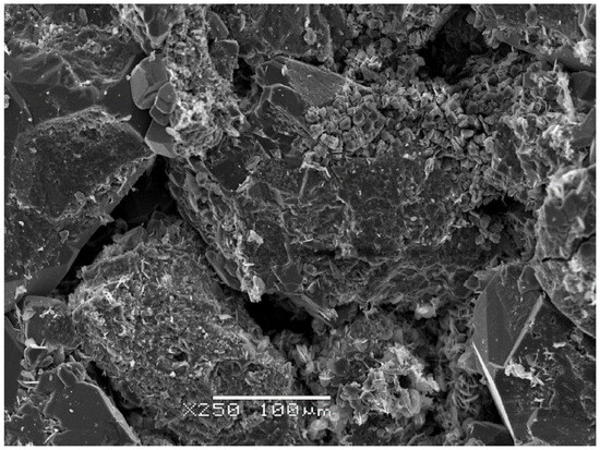 In addition to the deposition of iron sediments, it has been observed that the pores and channels formed as a result of brine pressure often take on complex shapes, with numerous branches pointing in different directions or at large angles (Figure 16). This structure may hinder the flow of the medium through the sample. Thin section analysis indicates that several significant changes occur during this process. Brine injection leads to the leaching of some clay minerals (Figure 17), which can then accumulate in pore constrictions [35,36]. At the same time, some grains are released from the grain skeleton and, as they move, can clog the throats connecting the pores.