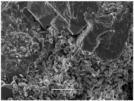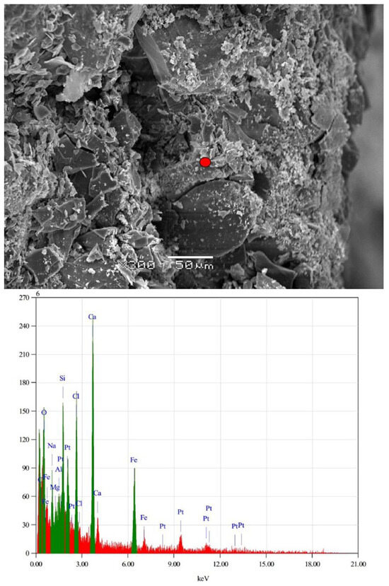 The SEM analysis after the flow tests focused on examining the rusty sediment formed on the surface of the cores. The analysis showed that at the contact point with sandstone, a deposit in the form of halite encrustation mixed with Fe minerals was formed. Unfortunately, due to the coarse-crystalline halite and xeromorphic form of the minerals, the analysis of the rusty material was difficult. EDS analysis indicated the presence of iron (iron oxides and hydroxides) and magnesium, suggesting the additional precipitation of carbonates such as dolomites and ankerites (Figure 20).