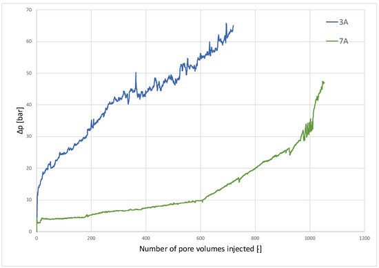 The first series of tests focused on the use of brine with a higher solid content. Samples 3 and 7 were selected for the experiments. The pressure increase during pumping is shown in the graph (Figure 7). During pumping through sample 3 of brine A, a steady increase in pressure was observed. After pumping approximately 350 pore volumes, significant pressure fluctuations were observed while maintaining the upward trend. In the next test using sample 7, a steady increase in pressure was initially observed. After pumping approximately 600 pore volumes, it was necessary to take a technical break to refill the tanks with brine. Despite resuming work with the same pumping rate, the pressure increase was much faster. After pumping approximately 900 pore volumes of the core, there was a drastic increase in pressure and intense fluctuations while maintaining an upward trend. This behaviour is attributed to the recurrent and cyclic clogging and subsequent reopening of the flow channels within the porous structure of the sample. The pronounced and abrupt pressure rise, which substantially deviated from the trends observed in other samples, can be explained by the combined effect of employing the brine with the highest level of contamination and the sample characterised by the lowest porosity.