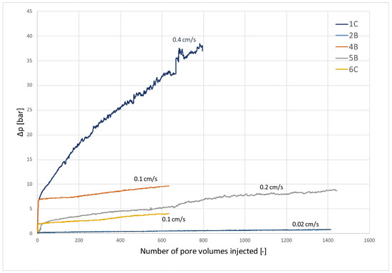 During experiments using brines with a lower concentration of suspended particles, a steady pressure increase with localised, sudden increases and decreases was observed (Figure 8). This indicates repeated blockages and clogging of the fluid flow paths. The rate of pressure increase is closely correlated with the flow velocity of the brines. This indicates the mobilisation of clay particles as a result of the disturbance of electrostatic forces in the rock medium and, thus, the detachment of clay particles from the grain skeleton. The higher the flow velocity, the faster the increase in pressure at the same volume of pore space pumped through. The second conclusion is the limited influence of particles suspended in the brine. It is important to note that samples 4 and 6 show a similar pressure increase despite different porosities and purity of the brines pumped through them. The graph (Figure 8) shows this in the form of parallel pressure increase curves. A common feature of these samples is their similar flow velocity and pressure increase rate. This suggests that the mobilisation of clay particles dominates over clogging with suspended particles.