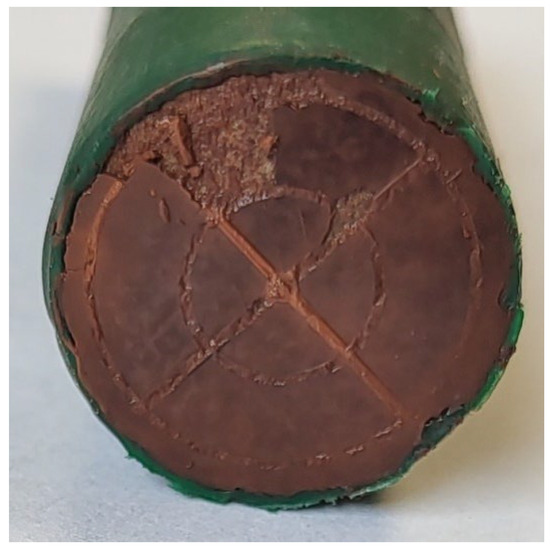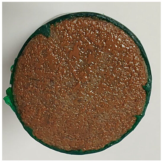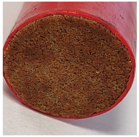 After completing the experiments, a filter cake consisting of rust-red sediment was observed on the front surface of each core. The photographs (Figure 9, Figure 10, Figure 11 and Figure 12) compare the core before the experiments and three samples through which 4 litres of brines A, B and C were pumped. The thickest layer of sediment was identified on the cores through which brine A was pumped, a smaller amount on the cores through which brine B was pumped, and the smallest amount on the samples through which brine C was pumped.