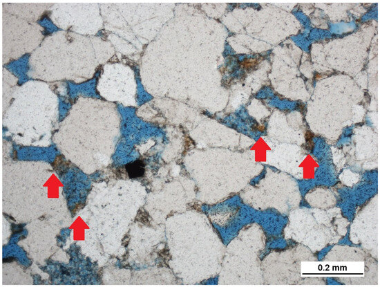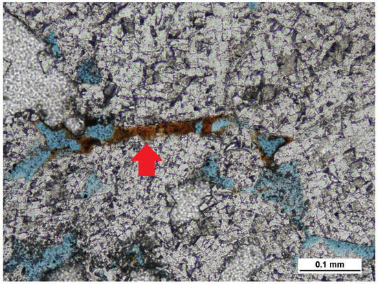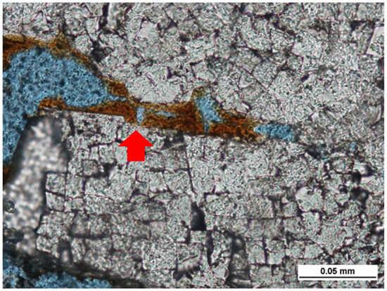 Microscopic image (transmitted light, without polariser). Blocking of pore throats by iron hydroxide particles (red arrow).