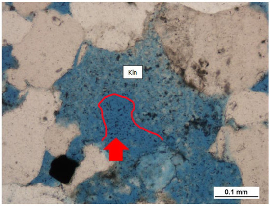 Microscopic image (transmitted light, without polariser) The pore space is partially filled with kaolinite, and an irregularly round void in the centre of the photograph (red arrow) is noticeable—probably the result of washing out.