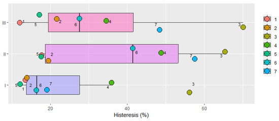 Distribution of hysteresis results; I—sample before brine injection, II—after brine injection, front part, III—after brine injection, rear part.