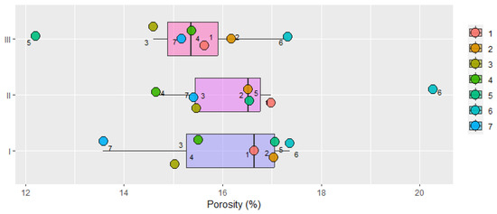 Distribution of open porosity results; I—sample before brine injection, II—after brine injection, front part, III—after brine injection, rear part.
