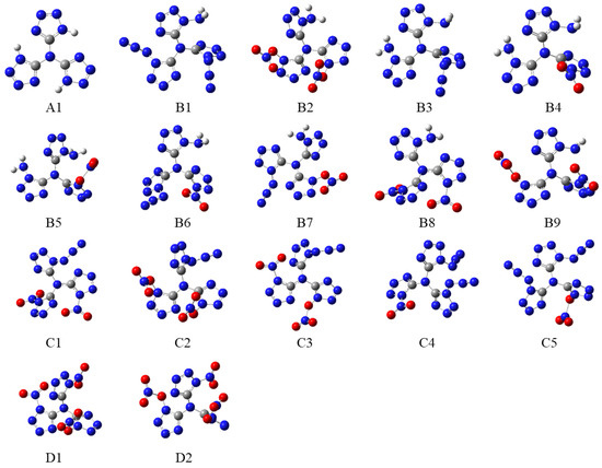 Optimized structures of the high-energy-density nitrogen-rich energy storage molecular systems. The grey, white, red, and blue balls represent C, H, O, and N atoms, respectively.