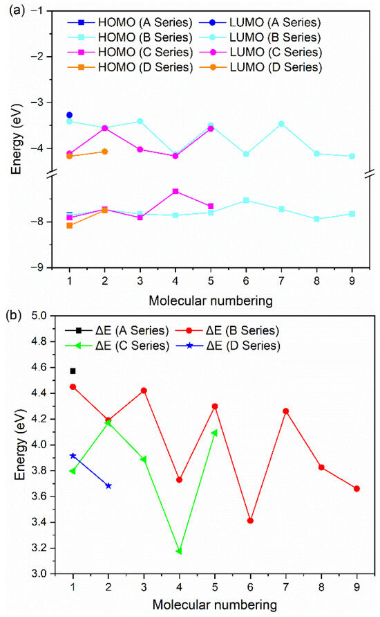 The chemical reactivity of these energy storage molecules can be quantitatively assessed using the HOMO-LUMO energy gap (ΔE). Figure 4 displays the corresponding HOMO, LUMO, and ΔE values. Typically, a larger ΔE correlates with greater molecular stability, as it impedes electron transitions between these orbitals. The LUMO energy level position affects the ability of the molecule to accept electrons (electrophilicity). The LUMO energy levels of the D series molecules in the figure are significantly lower than those of other series molecules, indicating that they have the strongest electron accepting ability (strong electrophilicity), which is closely related to the strong electron withdrawing groups (nitro, nitrate ester groups) present in their structure. The LUMO of the A series molecules has the highest energy level and the weakest electrophilicity. The HOMO energy level reflects the ability of a molecule to provide electrons (nucleophilicity). From the figure, it can be seen that the HOMO energy levels of the C series molecules are relatively higher, indicating that they are more prone to losing electrons (with strong reducibility), which is related to the strong electron donating groups present in their structure. The relatively low HOMO energy levels in the D series molecules indicate a weak ability to provide electrons. As shown in Figure 4b, there are significant differences in ΔE values between different series molecules. The A series molecules have the largest ΔE values, indicating that their electronic excitation requires higher energy, the molecular ground state stability is the highest, and the chemical reaction activity is relatively lower. The B and C series molecules have a centered ΔE values and moderate stability. The D series molecules have the smallest ΔE values and are most prone to electronic transitions, indicating relatively poor ground state stability and the possible highest chemical reactivity. Overall, molecule A1 with amino substituents achieved good electronic balance, which endowed the molecule with high kinetic stability but low chemical reactivity. Molecules with coexisting push–pull electron effects in substituent combinations (such as the coexistence of amino and nitro groups) (B and C series) have relatively balanced chemical properties and certain reactivity. Molecules with strong electron withdrawing substituents (such as multiple nitro and nitrate ester groups) (D series) exhibit strong electrophilicity and are expected to have relatively poor stability and high sensitivity.