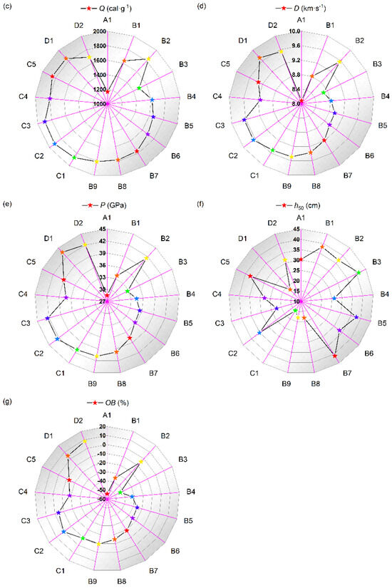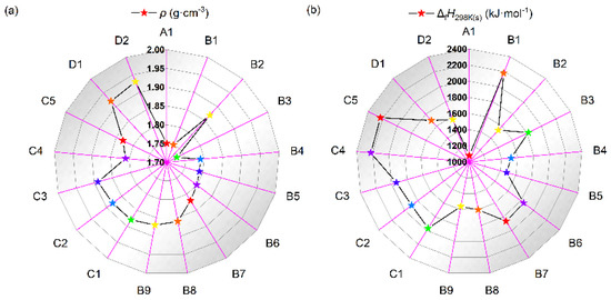 Energetic properties, containing density (ρ), heat of formation (ΔfH298K(s)), detonation heat (Q), detonation velocity (D), detonation pressure (P), and oxygen balance (OB), represent key attributes of energetic molecular systems. Figure 5a demonstrates how substituent type, quantity, and location substantially influence molecular density. Generally, density increases with substituent count. The benchmark molecule A1 has the lowest ρ value of 1.75 g·cm−3 due to its lack of any substituents. For B series energy storage molecules with one fixed -NH2 substituent, the ρ values of all molecules are no more than 1.90 g·cm−3 and even those of four molecules B1, B3, B4, and B5 are no more than 1.80 g·cm−3, which is owing to the presence of more -NH2 and -N3 in these molecules that contribute less to the ρ of them. For C series power molecules with one fixed -N3 substituent, the ρ values of these molecules are significantly higher than those of the B series molecules, except for molecules C4 and C5, because these two molecules contain two -N3 substituents that contribute less to the ρ. For molecule C1 containing only one -N3 and two -NO2, molecule C2 containing only one -N3 and two -ONO2, and molecule C3 containing only one -N3 and one -NO2 and one -ONO2, their density values are close to 1.90 g·cm−3, which are 1.88 g·cm−3, 1.88 g·cm−3, and 1.89 g·cm−3, respectively, which is more than that of 1,3,5-trinitro-1,3,5-triazacyclohexane (RDX) [34], indicating that -NO2 and -ONO2 contribute more to the ρ of energy storage molecules than that of -N3. It can be clearly seen that the ρ of D series molecules is higher than 1.90 g·cm−3, with D1 being 1.92 g·cm−3 and D2 being 1.93 g·cm−3, which is more than that of 1,3,5,7-tetranitro-1,3,5,7-tetraazacyclooctane (HMX) [34]. This is because the substituents of the D series molecules are all composed of -NO2 or -ONO2, which contribute significantly to the ρ of energy storage molecules. Analysis of ρ reveals the substituent impact sequence is -ONO2 > -NO2 > -N3 > -NH2. Specifically, incorporating -ONO2 or -NO2 groups effectively enhances ρ values, whereas -N3 and -NH2 substitutions yield minimal density improvement. These findings provide critical guidance for designing high-energy-density compounds. Notably, molecules B2, B8, B9, C1, C2, C3, D1, and D2 surpass RDX in density, positioning them as promising candidates.