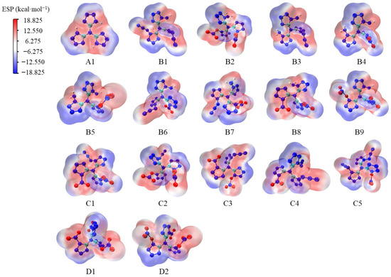 The molecular surface electrostatic potential (ESP) is of great significance in predicting the reactivity of molecules [35,36,37]. Figure 6 shows the ESP of these energy storage molecular systems.
