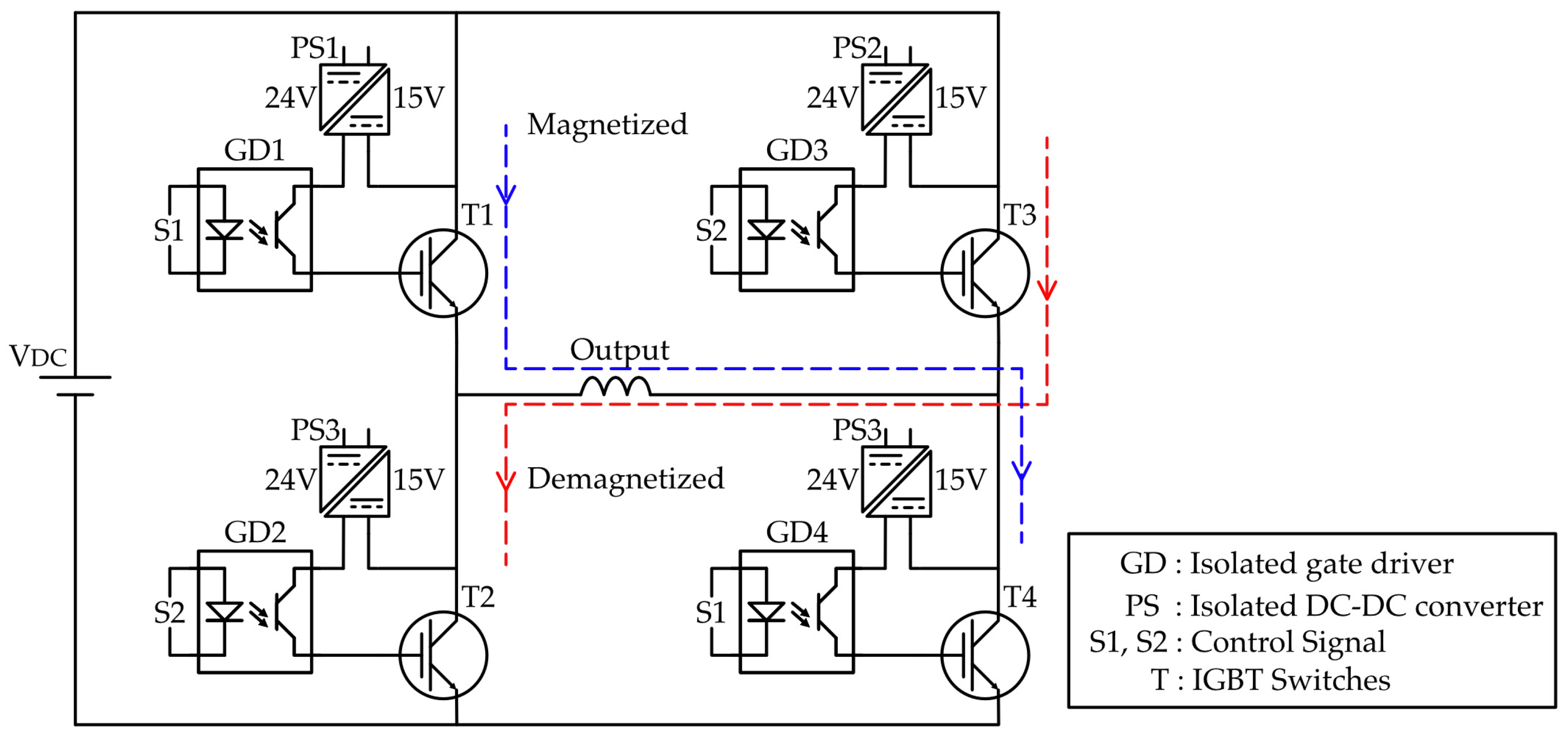 In Figure 4, the CPG circuit is designed using a full-bridge configuration of four IGBT switches (T1–T4), each driven by isolated gate drivers (GD1–GD4). The primary function of this circuit is to control both the direction of current through the load and to cut off the current according to reference input, enabling precise magnetization and demagnetization control. Control signal S1 simultaneously drives IGBTs T1 and T3, allowing current to flow in one direction for magnetization, while control signal S2 drives IGBTs T2 and T4, reversing the current flow for demagnetization. To provide proper isolation and stable gate drive voltage, isolated DC-DC converters (PS1–PS3) are used, each converting a 24 V input into a 15 V isolated output. The gate drivers are referenced to different potentials depending on the switching state of the IGBTs, and without proper isolation, biasing or short circuits could occur. The upper-leg switches T1 and T3 have separate isolated DC to DC converter (PS1 and PS3), while the lower-leg switches T2 and T4 share the same one (PS3) since they are both referenced to the common negative rail of the DC bus, allowing them to safely operate with a single isolated power supply. The components and parts used to develop the CPG circuit are listed in Table 2.