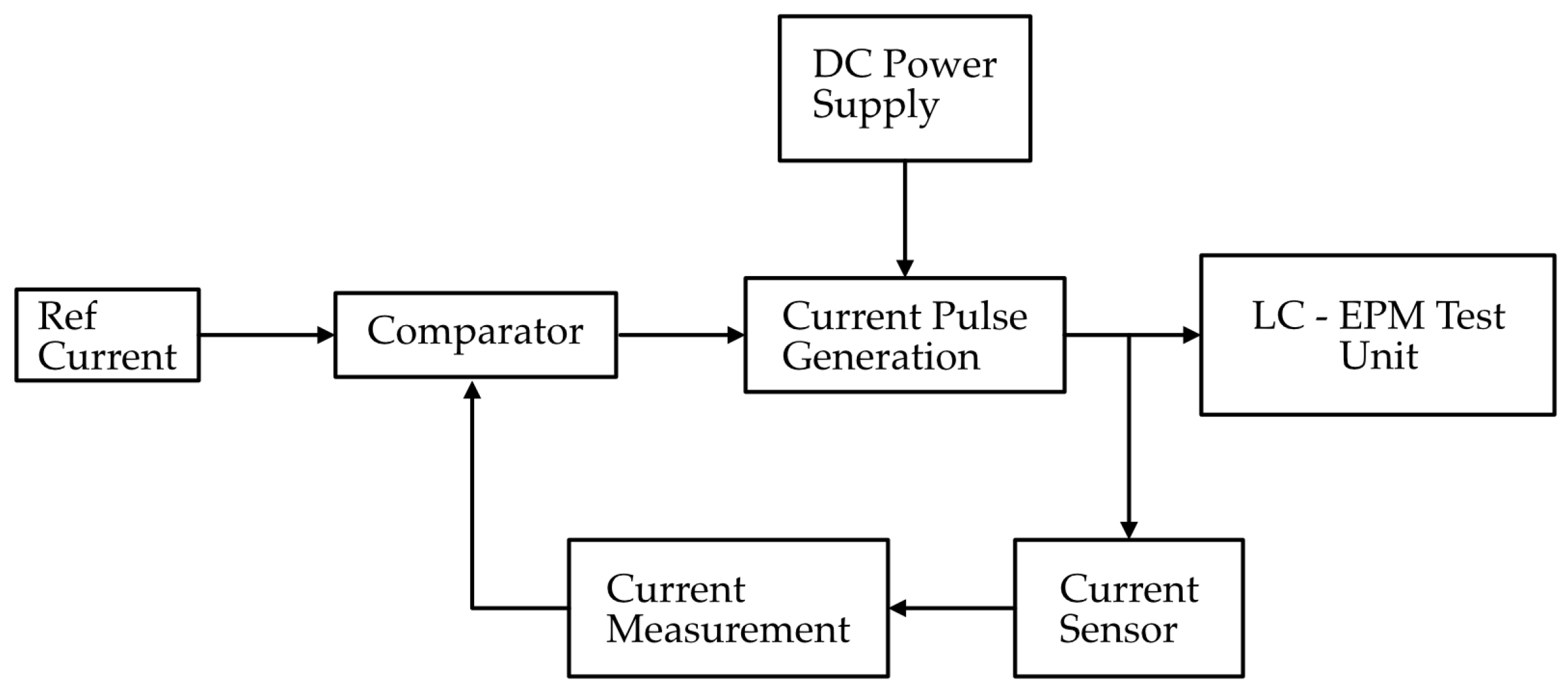 The first stage of the magnetic flux control system focuses on regulating the coil current using a closed-loop feedback scheme, as illustrated in Figure 6. A reference current is provided as the input command, which represents the desired magnetizing (forward) or demagnetizing (reverse) current to be applied to the EPM lifting unit. This reference is compared with the actual coil current, measured through a current sensor. The comparator calculates the error between the reference and measured current, and this error signal is used to adjust the switching of the current pulse generation circuit. The current pulse generation circuit, powered by the DC supply, delivers the required current pulses to the magnetic clamp unit while maintaining the commanded current level. This closed-loop control enables precise control of the applied current magnitude and direction, which is essential for producing consistent excitation pulses for flux control in the later stage.