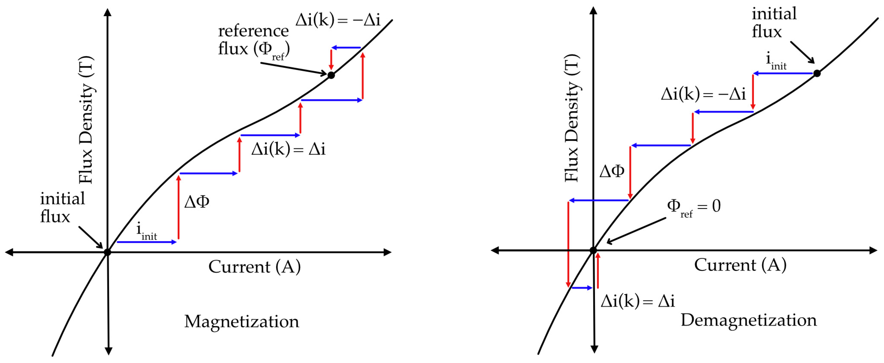 where f i is the nonlinear flux–current hysteretic relationship and non-monotonic in magnetic materials. Convergence depends on i and the local slope f i ( k of the flux–current curve. Smaller step sizes yield slower convergence but higher stability, while excessively large steps may lead to oscillation around Φ r e f . The convergence is guaranteed if the following condition is satisfied:
