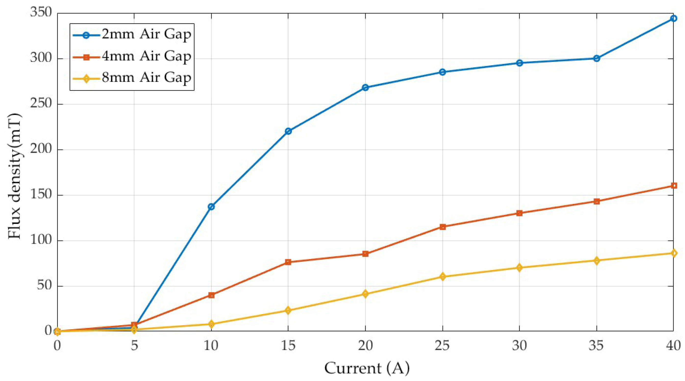 Figure 11. Flux density vs. current characteristics at different air gaps.