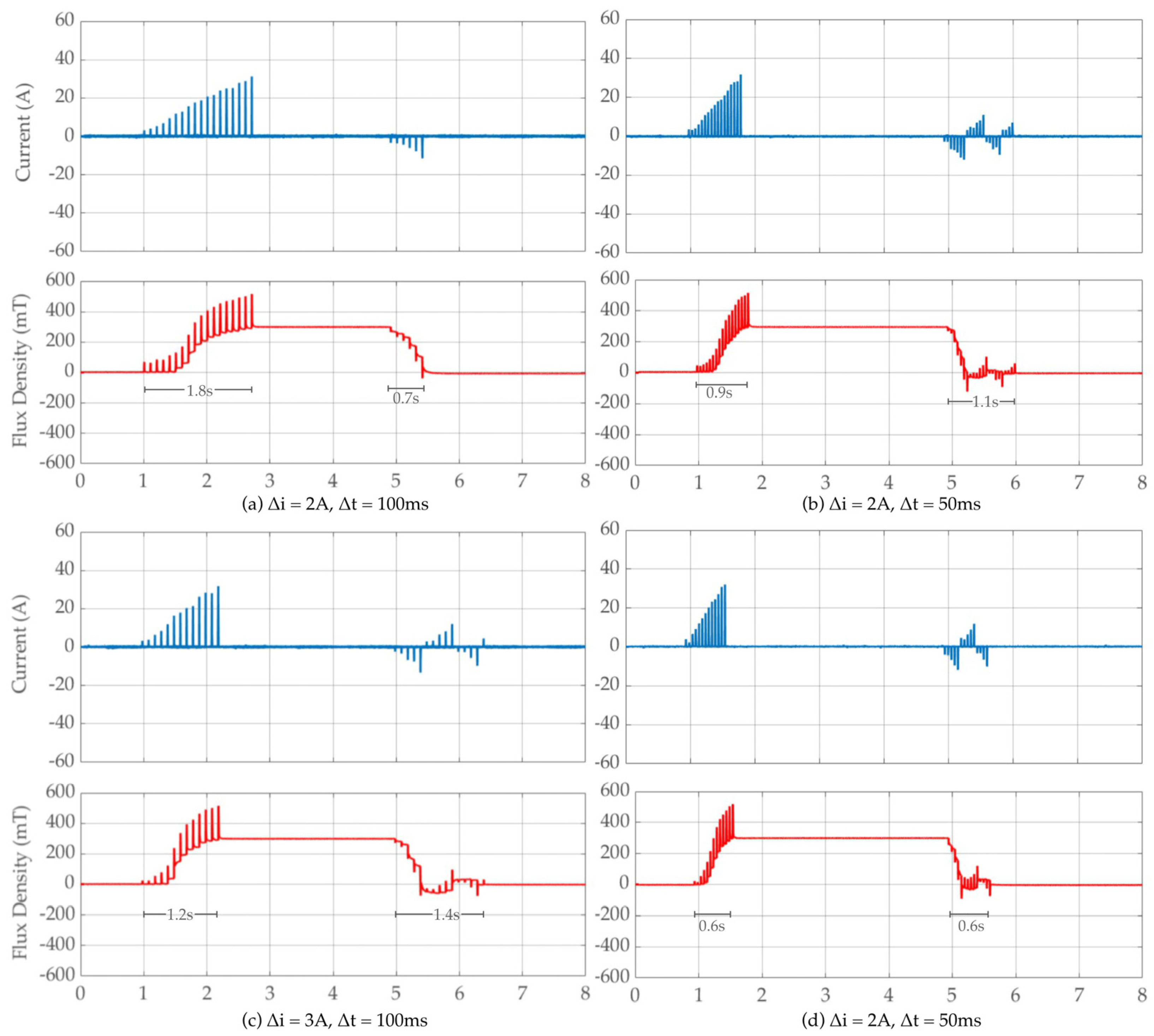 Current step ( i ) and time step between each pulse ( t ) could be adjusted to optimize the settling time of the HCS flux control. In Figure 14, HCS flux control is tested with different i (2 A, 3 A) at t (100 ms, 50 s). It is observed that larger current step 3 A and shorter intervals in Figure 14d result in faster magnetization, reducing the settling time from about 1.8 s to 0.6 s. However, this setting introduces higher flux ripple, which causes multiple overshoots at demagnetizing. Conversely, smaller current steps or longer intervals provide a smoother and more stable flux control approach with longer settling time. The demagnetization phase provides a smoother and more stable approach to bring the flux near zero. Overall, the HCS system achieves reliable and stable flux control. The control works well even in variation in current pulse amplitude and time steps between the current pulses. On the other hand, control response can be accelerated when the current pulse amplitude and time steps between the consecutive pulses have been optimized.