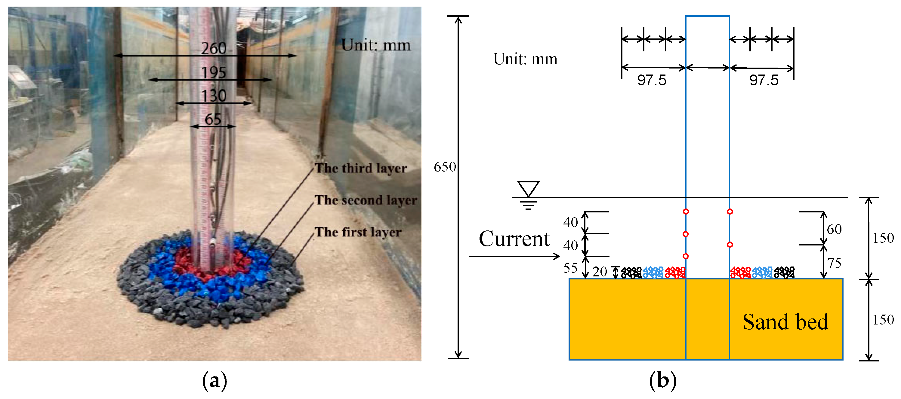 DeVos et al. [21] studied the size of riprap required for the protective measures of riprap under scour, put forward the design formula for determining the size of the required stone size, and adjusted it by waves, so that the design formula is also applicable to irregular waves. On this basis, DeVos et al. [22] obtained a more economical design by allowing some movement of the top-layer stones of the scour protection. Richardson et al. [23] suggested that the stone-throwing protection should be at least twice the pile width and proposed a formula for determining the stone size, which was further adopted by the US Highway Administration. Lagasse [24] proposed three types of stone-throwing layer arrangement, i.e., placing rock on the surface of the riverbed, in a scour pit, or in a hand-excavated pit near the foundation, and below a certain depth from the mean riverbed elevation.