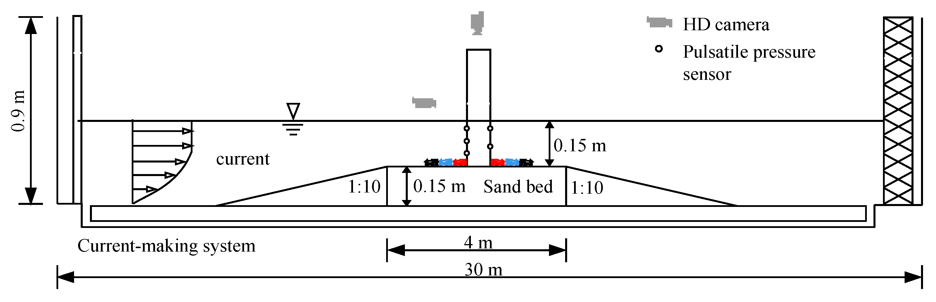 In the middle of the flume, a 4 m × 0.6 m × 0.15 m horizontal sandy seabed was arranged, with a 1:10 slope on both sides. The model was placed in the middle of the seabed, with its lower part buried in the sediment. The specific seabed design, model, and equipment layout are shown in Figure 2.