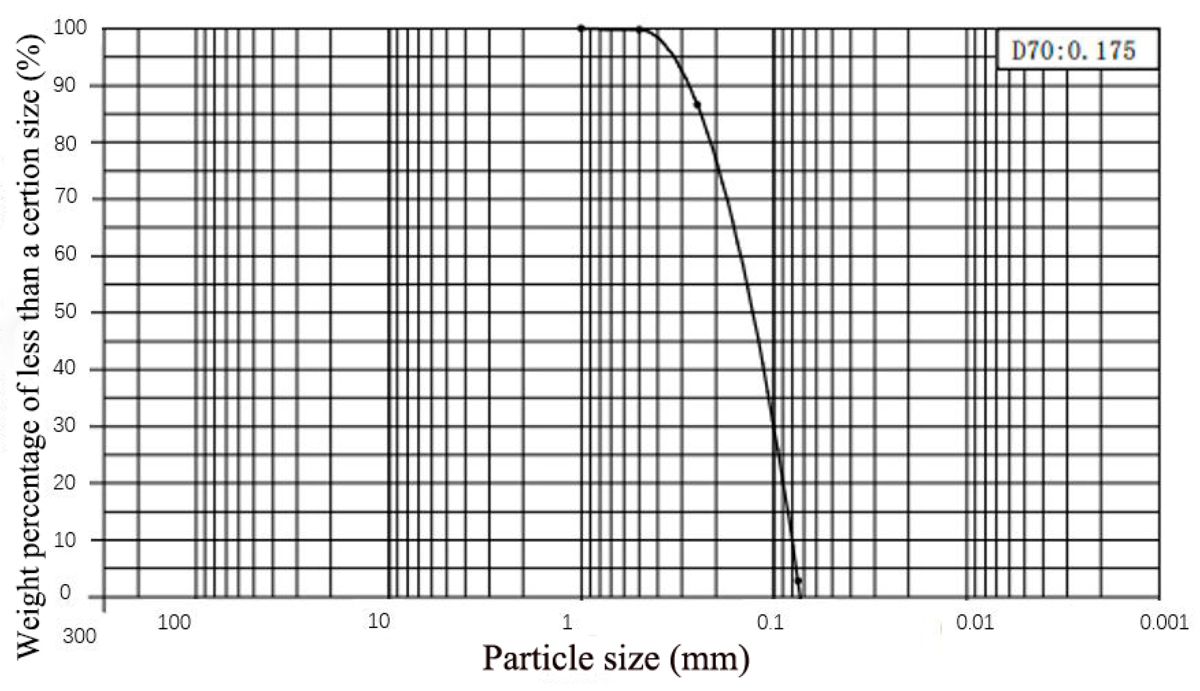 In this experiment, the prototype sand was used, and its median particle size is 0.129 mm, as shown in Figure 3. The riprap is made of limestone gravel, and the median diameter is 9 mm. According to Melville and Coleman [27], the coverage diameter of the riprap layer was three times the diameter of the foundation, the thickness of the riprap layer was 2.22, and the propylene was stained in advance for differentiation.
