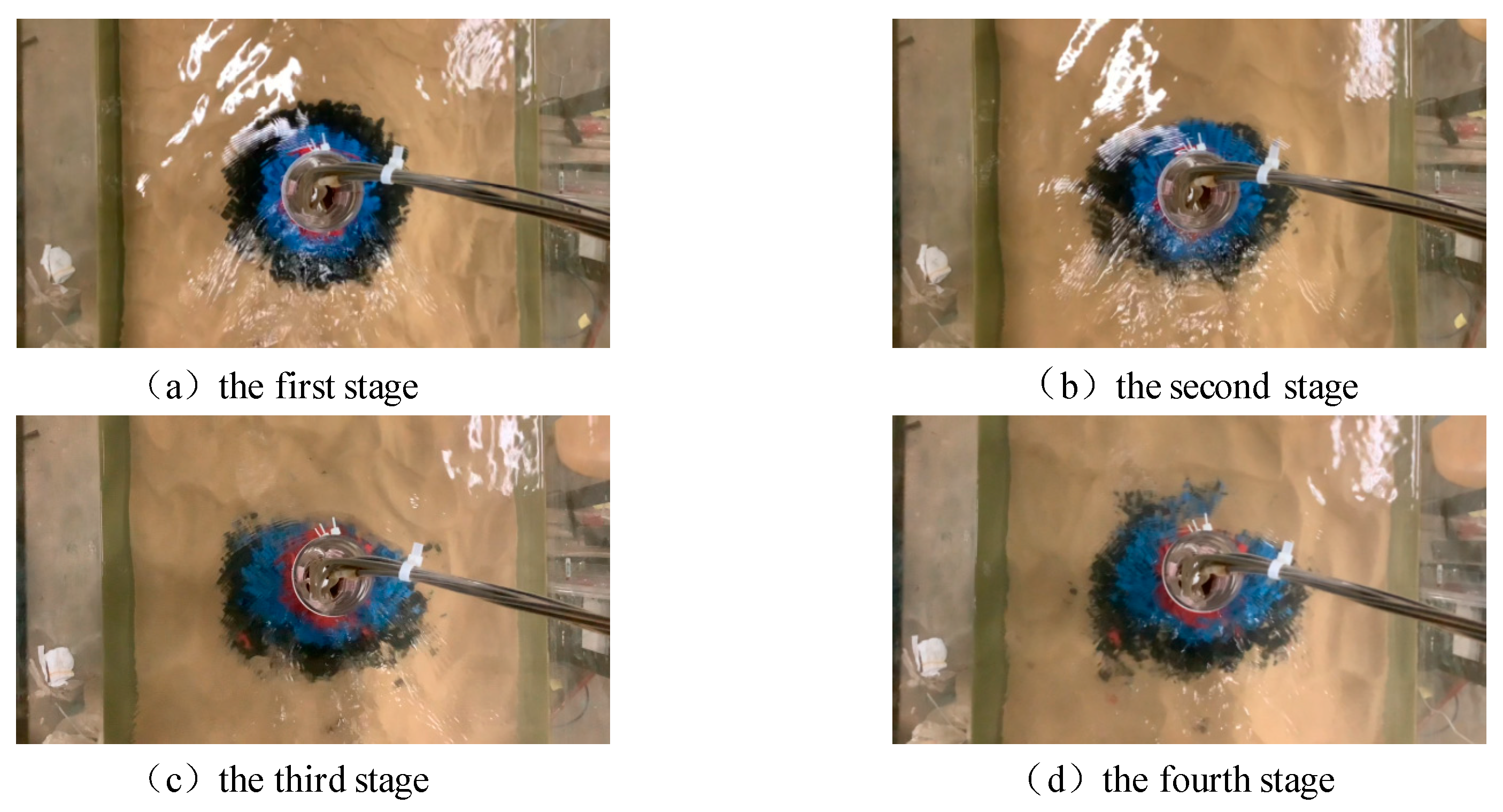 For the visual damage analysis, according to the research results of De Vos et al. [21,22], the riprap damage process can be divided into four stages: in the first stage, no movement of the stones; in the second stage, very limited movement of stones, the outer ring of black riprap cover stone is damaged representing very limited movement of stones; in the third stage, significant movement of stones, the middle ring cover stone is damaged representing significant movement of stones, without failure of the protection; in the fourth stage, the riprap protection fails and forming a stable seabed boundary. The four stages of scour under current are shown in Figure 4.