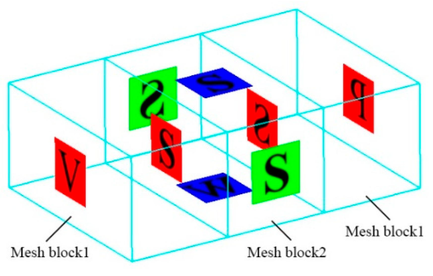 where ρ is the fluid density; V F is the volume fraction; u   v   w denote the fluid velocity in the x   y   z directions; A x   A y   A z denote the area fraction in the x   y   z directions; G x   G y   G z denote body acceleration in the x   y   z directions; f x   f y   f z denote viscous acceleration in the x   y   z directions, respectively.