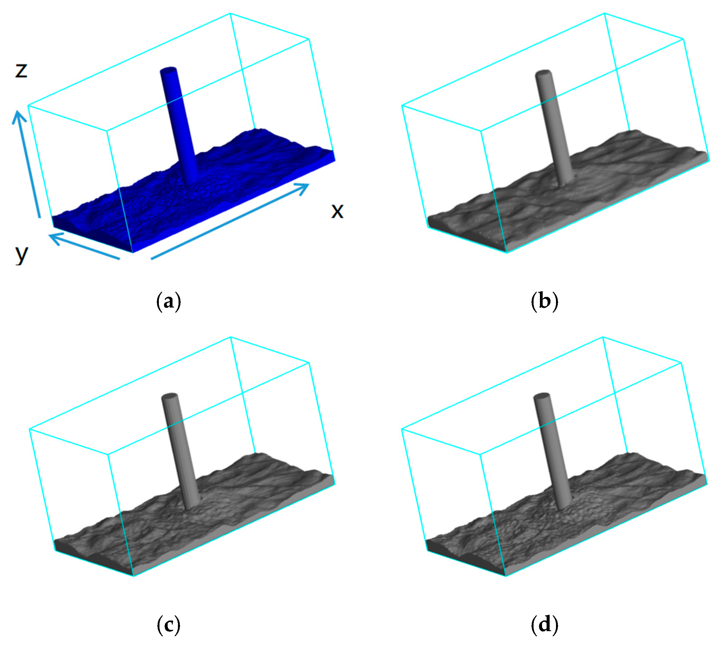 Figure 25 presents the three-dimensional vortex structure behind the cylindrical pile foundation with rock protection under the action of current, with a water depth of 0.15 m and a flow velocity of 0.387 m/s, during different scour stages (Q = 5). Combining Figure 23, Figure 24 and Figure 25, it can be observed that the wake vortex behind the pile is mainly composed of three parts: the vortex field near the water surface on both sides of the pile, the vortex field near the water surface behind the pile, and the vortex field near the seabed surface behind the pile. Comparing Figure 23 and Figure 25a, it can be seen that before implementing rock protection, there is significant shedding of vortices behind the pile in the direction of flow. After implementing riprap protection around the pile, the vortex field near the water surface on both sides of the pile remains relatively unchanged, while changes occur in the vortex field behind the pile near the water surface. The phenomenon of rotational shedding no longer occurs behind the pile, and the vortex near the riprap protection behind the pile forms a coarse and elongated shape. According to Figure 11, the reason for the changes in the vortex field after implementing riprap protection around the pile is that the flow disturbance and lift caused by the pile and riprap protection affect the formation of vortices above the riprap protection behind the pile. Comparing Figure 25a–d, as scour progresses, the shape and size of the wake vortex near the water surface remain basically unchanged, while the wake vortex near the riprap protection gradually becomes thinner and shorter, disappearing completely in the stable fourth stage of scour.