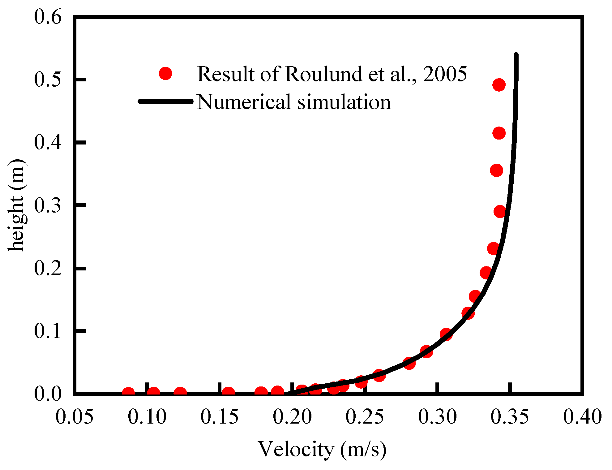 For the numerical flume in this paper, the Xmin section was set to Specified velocity, the Xmax section was set to Specified pressure, three sections were set to Symmetry, including Ymin, Ymax, and Zmax, and the section of Zmin was set to Wall. The water depth was 0.15 m, and the flow velocity was 0.387 m/s. Other conditions and parameters in the numerical model were consistent with the experimental conditions, and the initial conditions were set by giving the flow field characteristics of the water in the mesh computational domain.