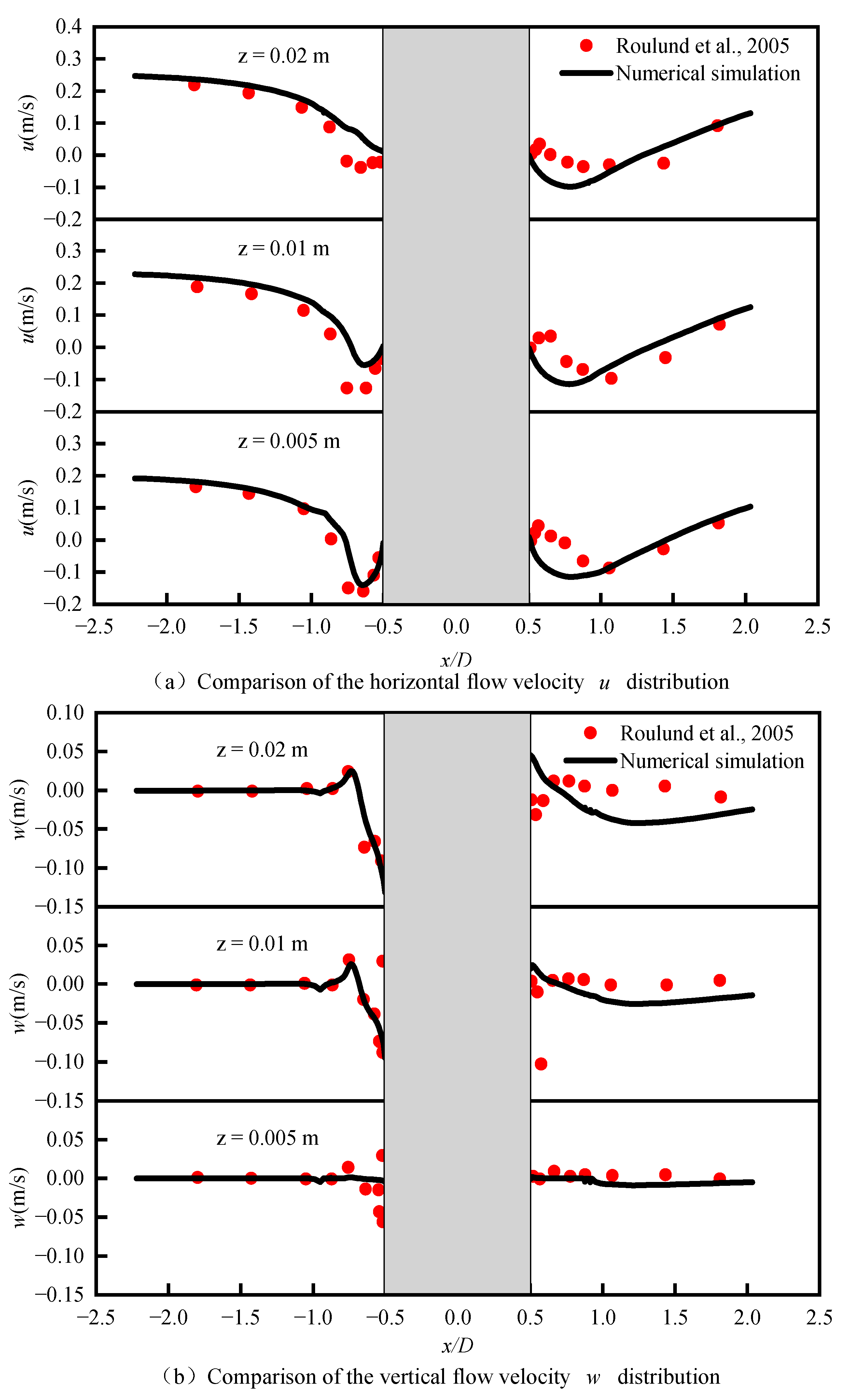 The data of Roulund et al. [29] was selected as a comparison, and the comparison between the experimental flume’s velocity section data and the numerical simulation results is shown in Figure 7. The velocities were sampled at three different depths from the bed: z = 0.005 m, 0.01 m, and 0.02 m. The horizontal velocity u comparison is shown in Figure 8a, and the vertical velocity w comparison is shown in Figure 8b. It can be seen that the numerical simulation results of horizontal and vertical flow velocity distribution at different water depths are in good agreement with the data of Roulund et al. [29], indicating the reliability of the numerical model.