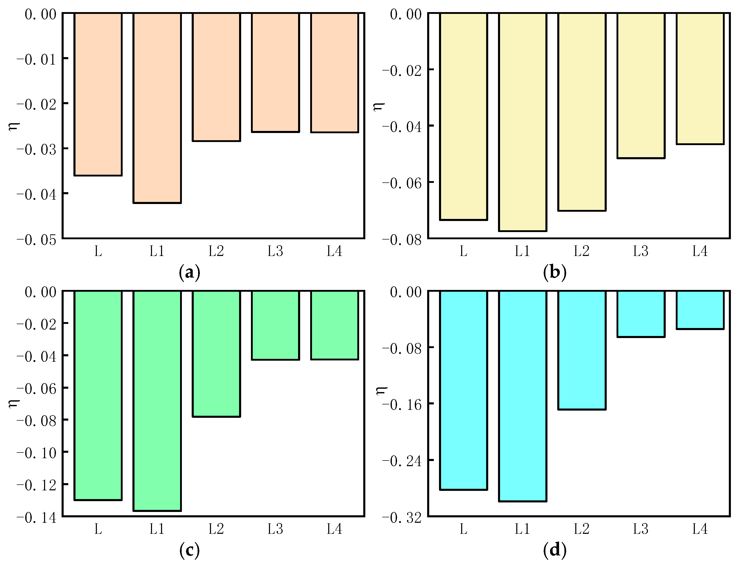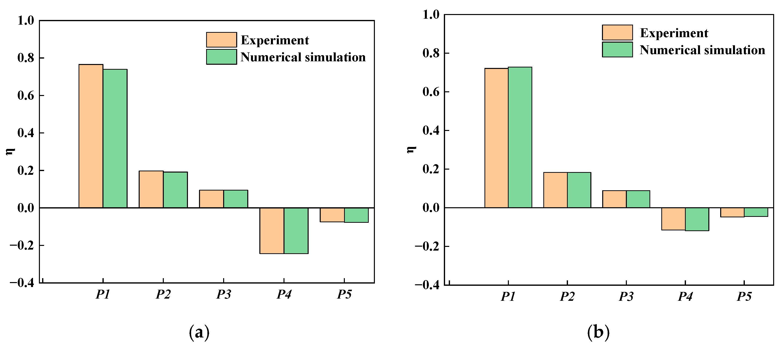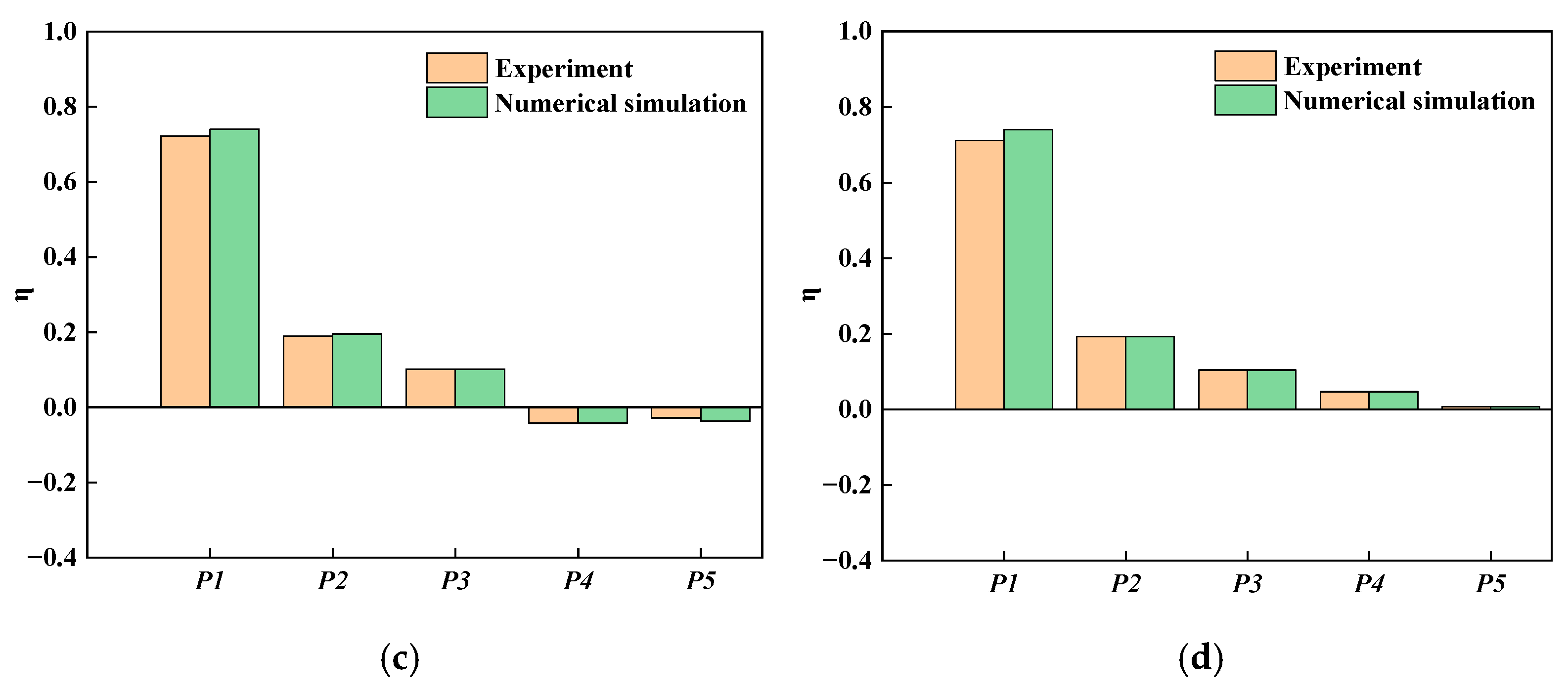 Figure 31. Numerical simulation of the pressure parameter η from the measurement point E1 to E4. (a) Measurement point E1. (b) Measurement point E2. (c) Measurement point E3. (d) Measurement point E4.