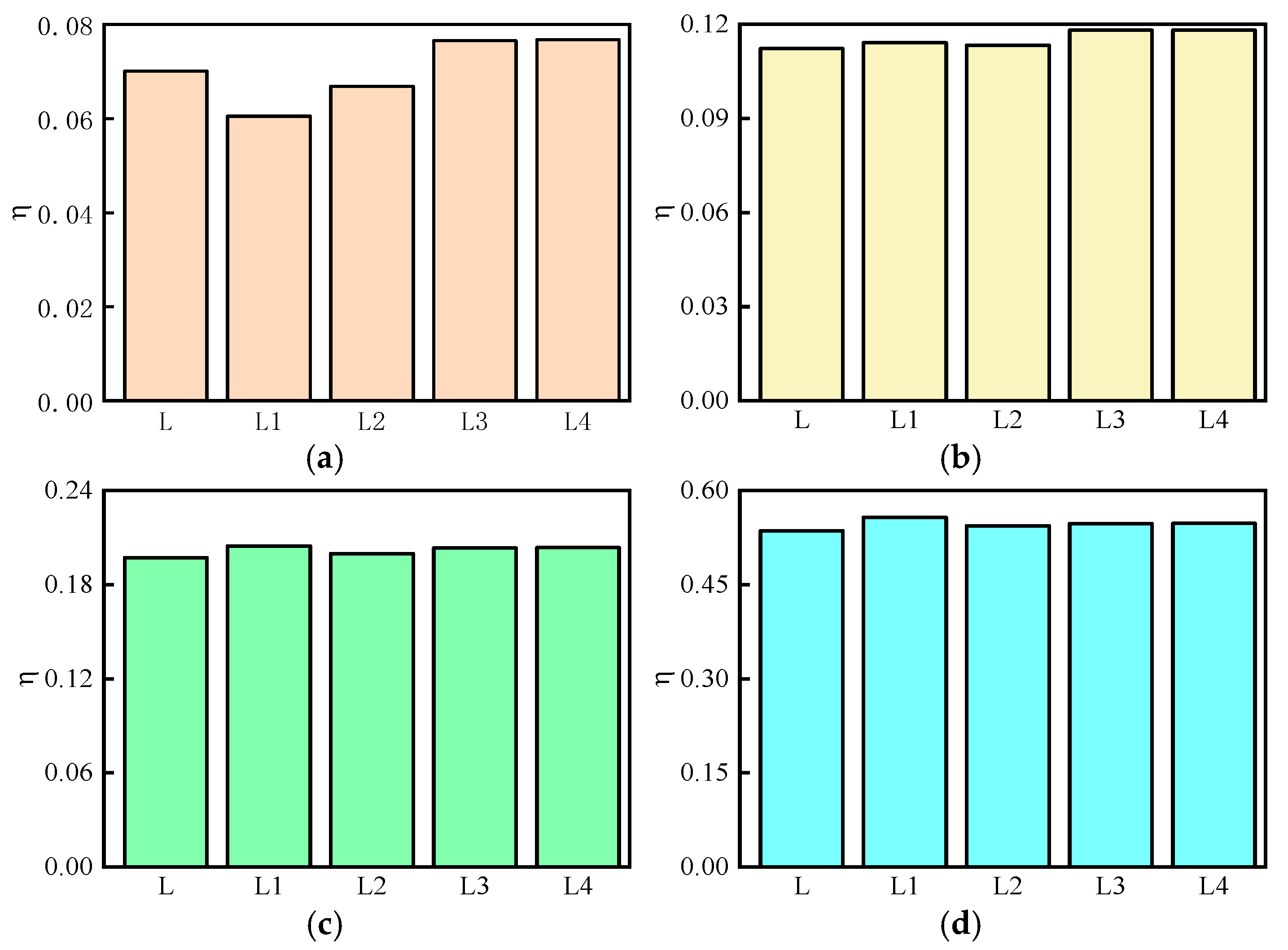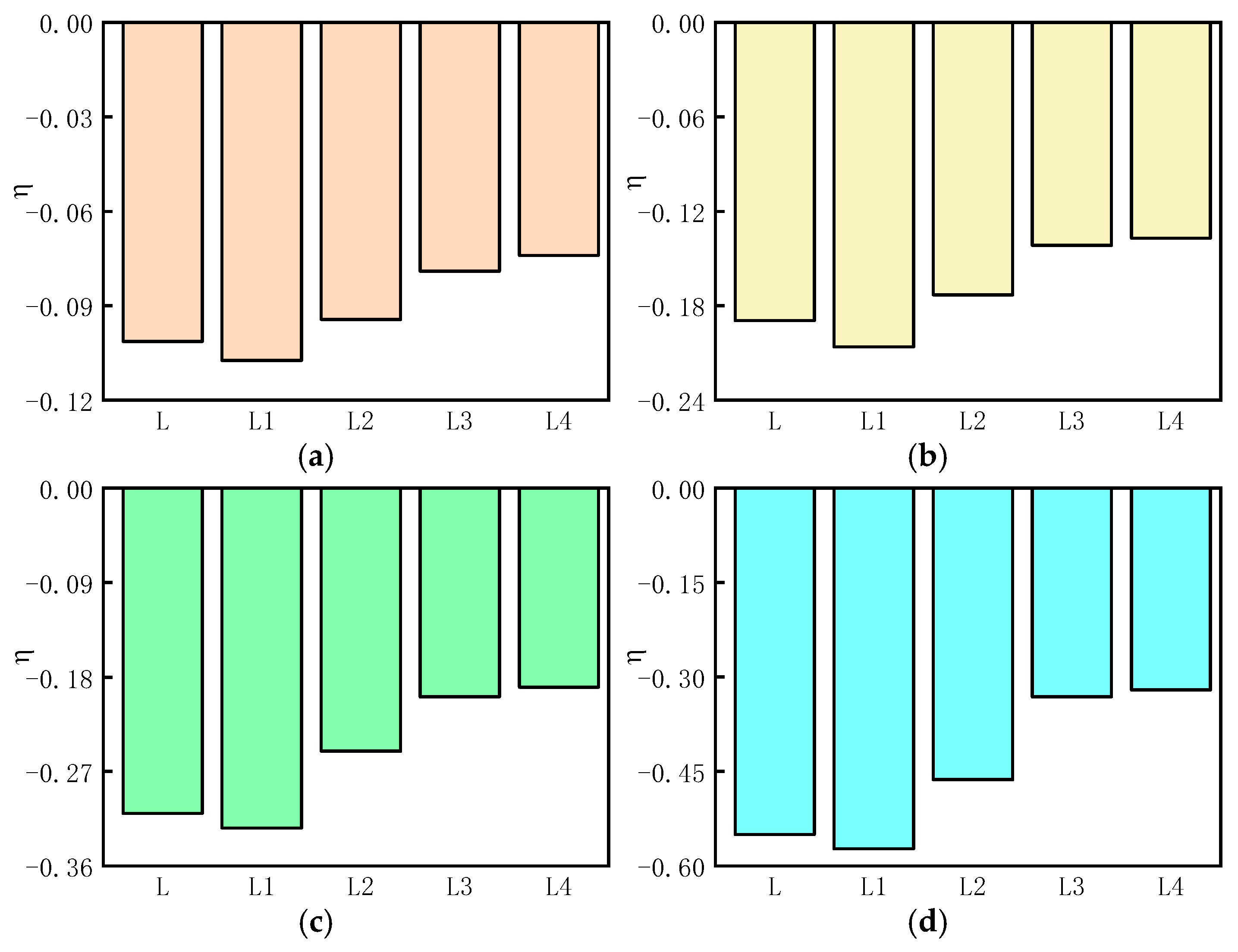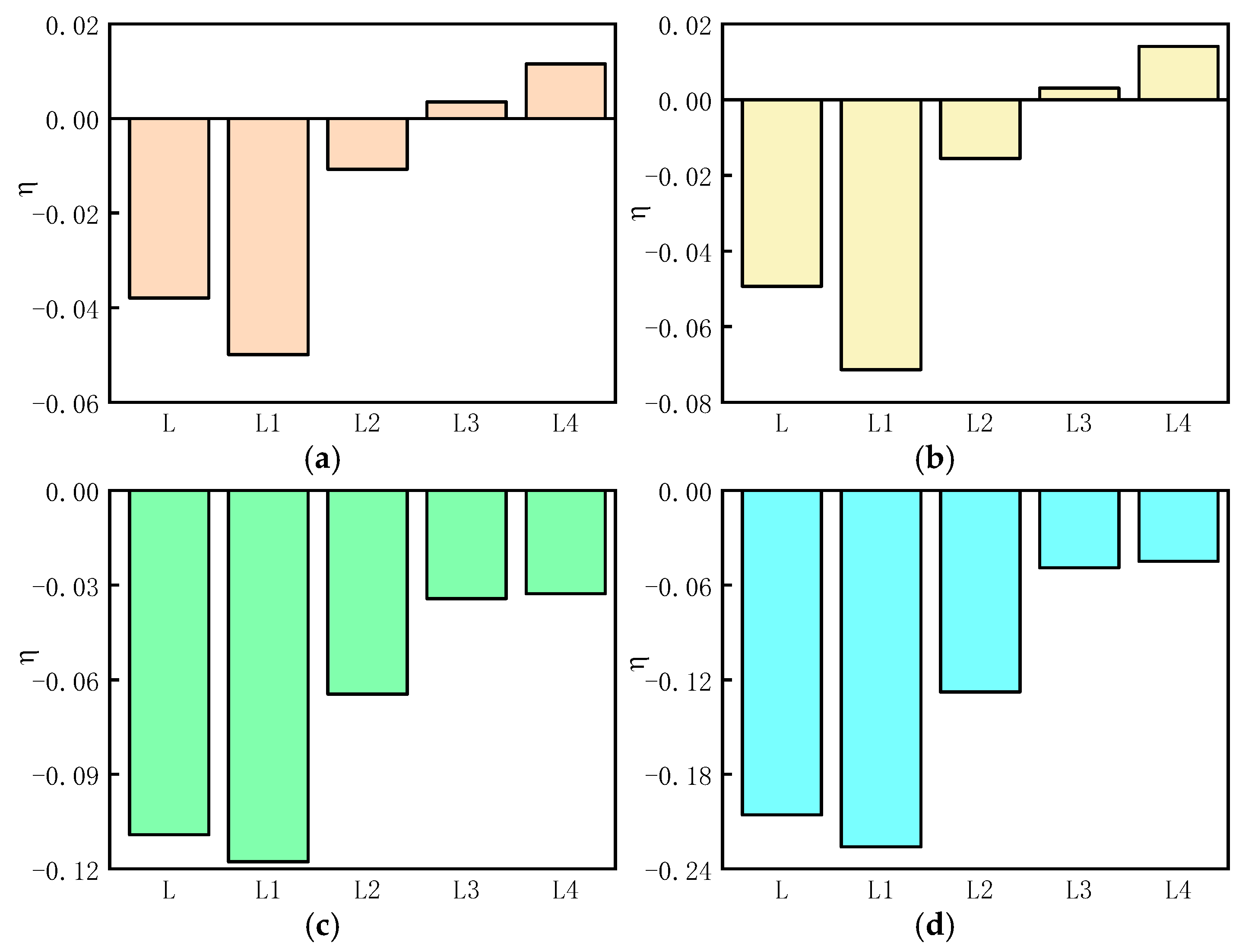 Figure 31. Numerical simulation of the pressure parameter η from the measurement point E1 to E4. (a) Measurement point E1. (b) Measurement point E2. (c) Measurement point E3. (d) Measurement point E4.