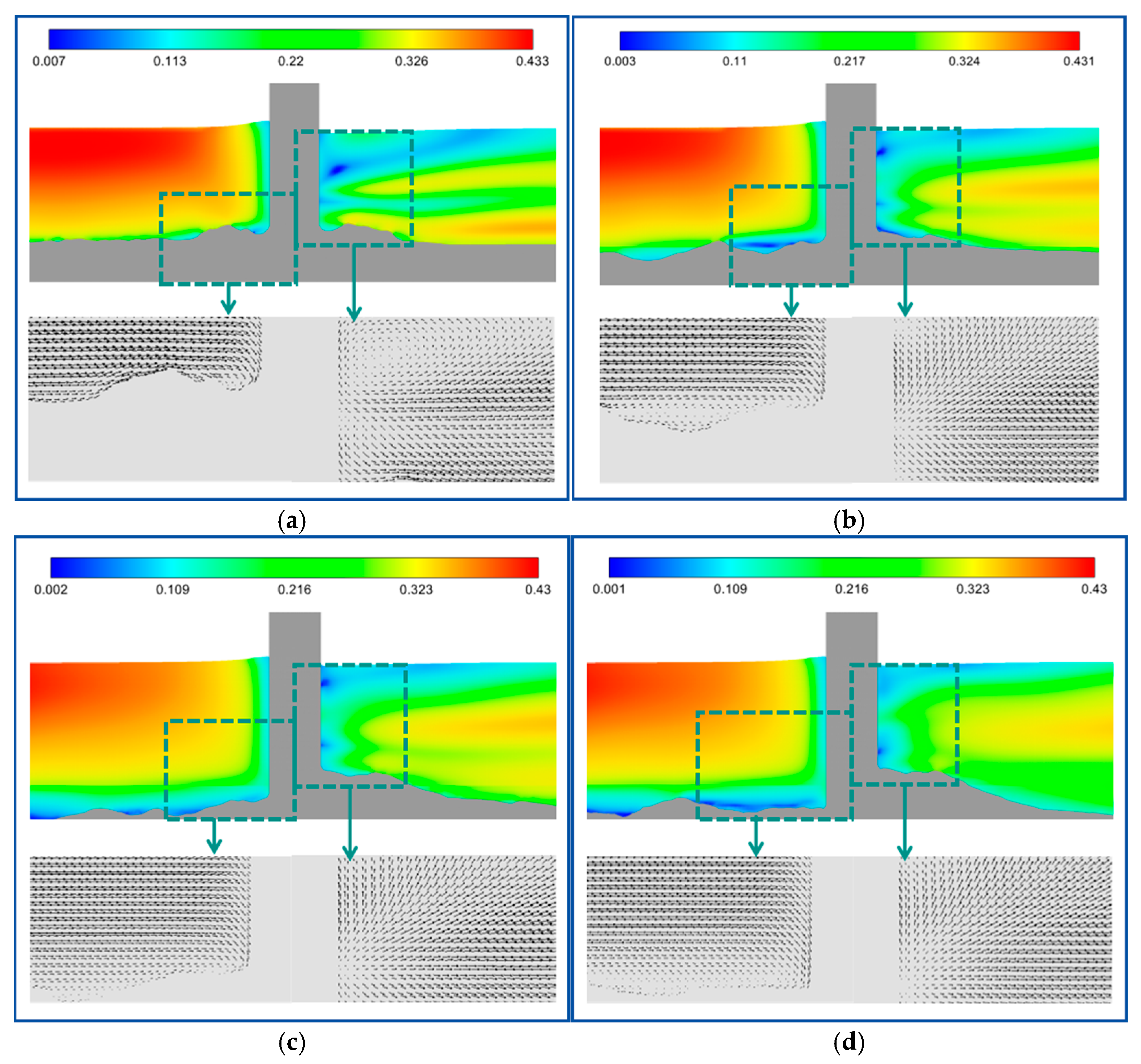 Figure 11. Velocity contour and velocity vector of the X-Z section at different scour stages. (a) The first stage. (b) The second stage. (c) The third stage. (d) The fourth stage.