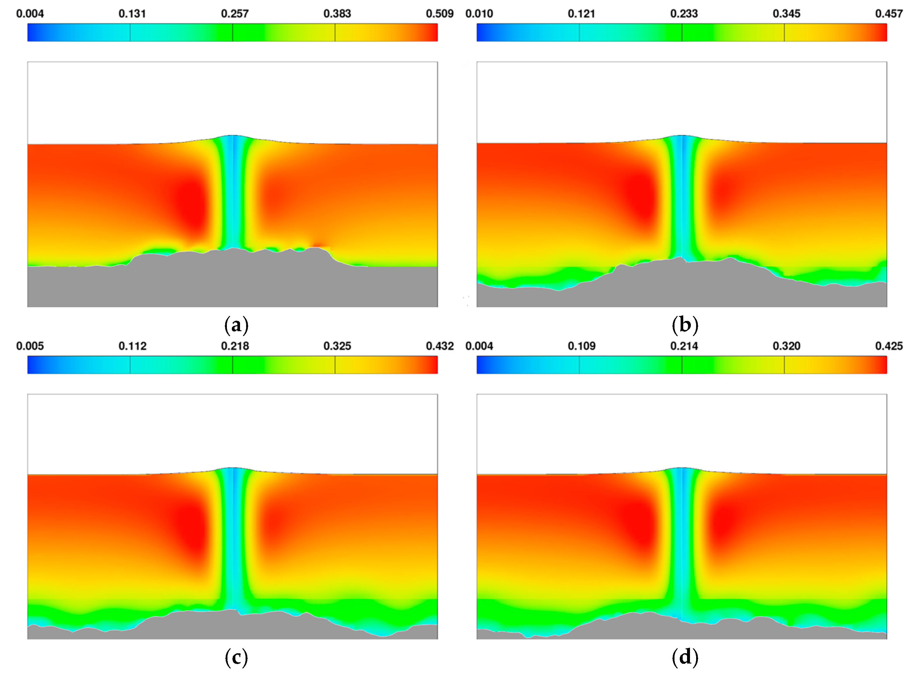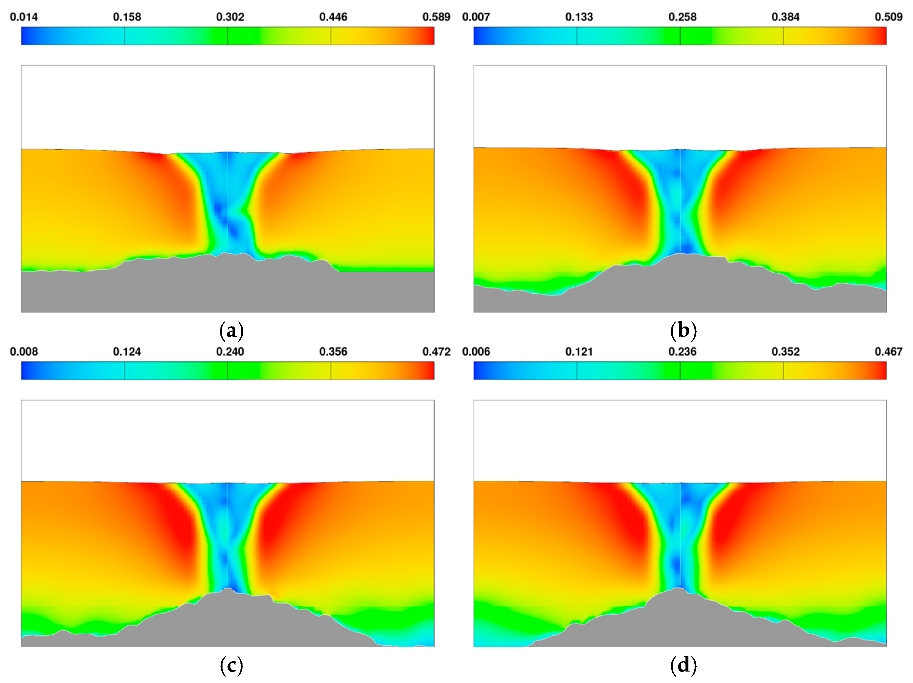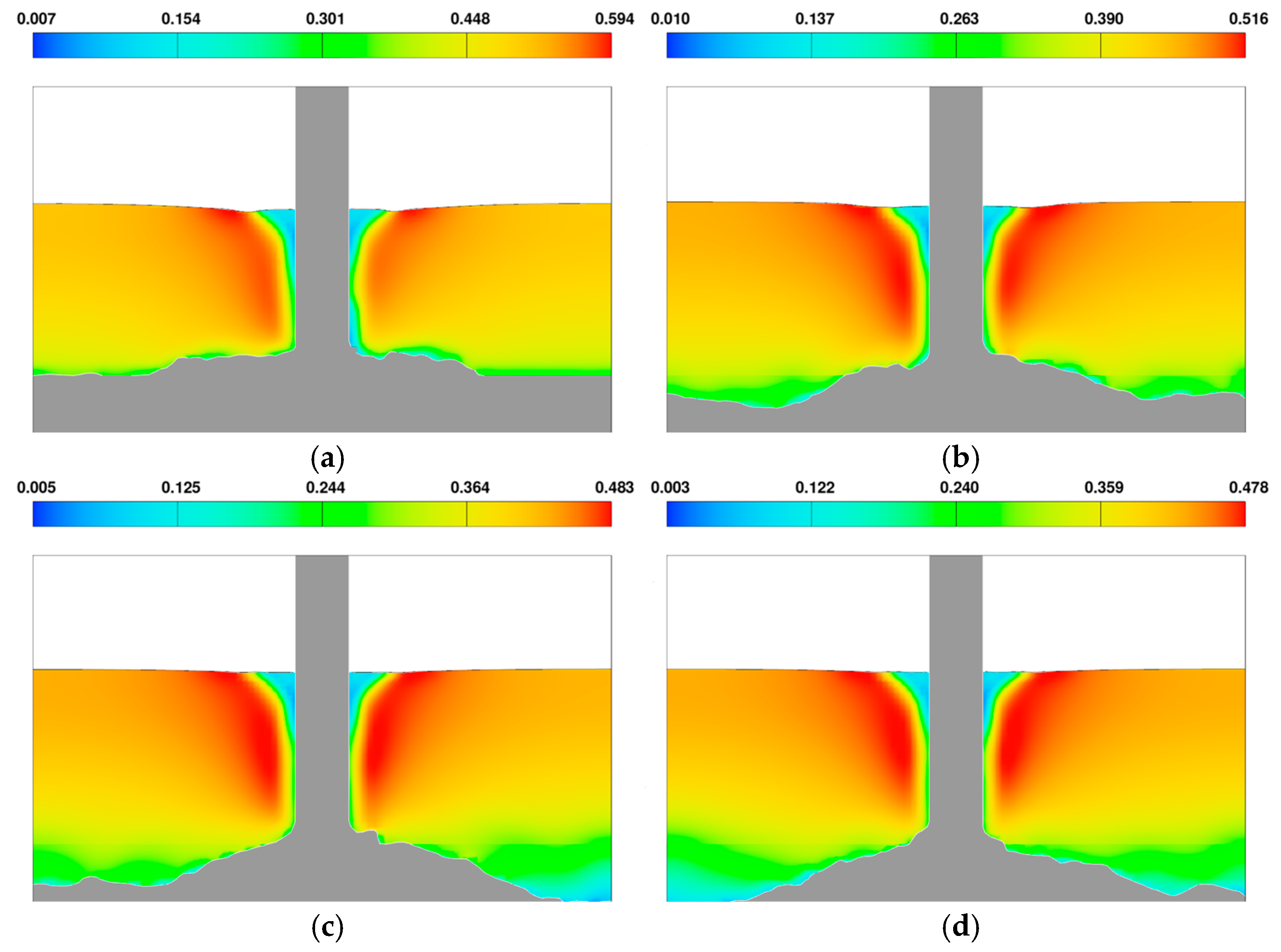 Comparing Figure 24a–d, it can be seen that after implementing riprap protection measures for the pile foundation, the range of vortices in front of the pile gradually decreases, and their shapes tend toward stability. Through an overall analysis combining Figure 23a and Figure 24, it is evident that the presence of riprap protection in front of the pile leads to a reduction in water height in front of the pile, enhancing the intensity of downward flow above the riprap protection. This results in the formation of larger horseshoe vortices in front of the pile. As scour progresses, the depth of scour in front of the pile tends to stabilize, leading to a gradual reduction in the range of the horseshoe vortices, with their shapes approaching stability.