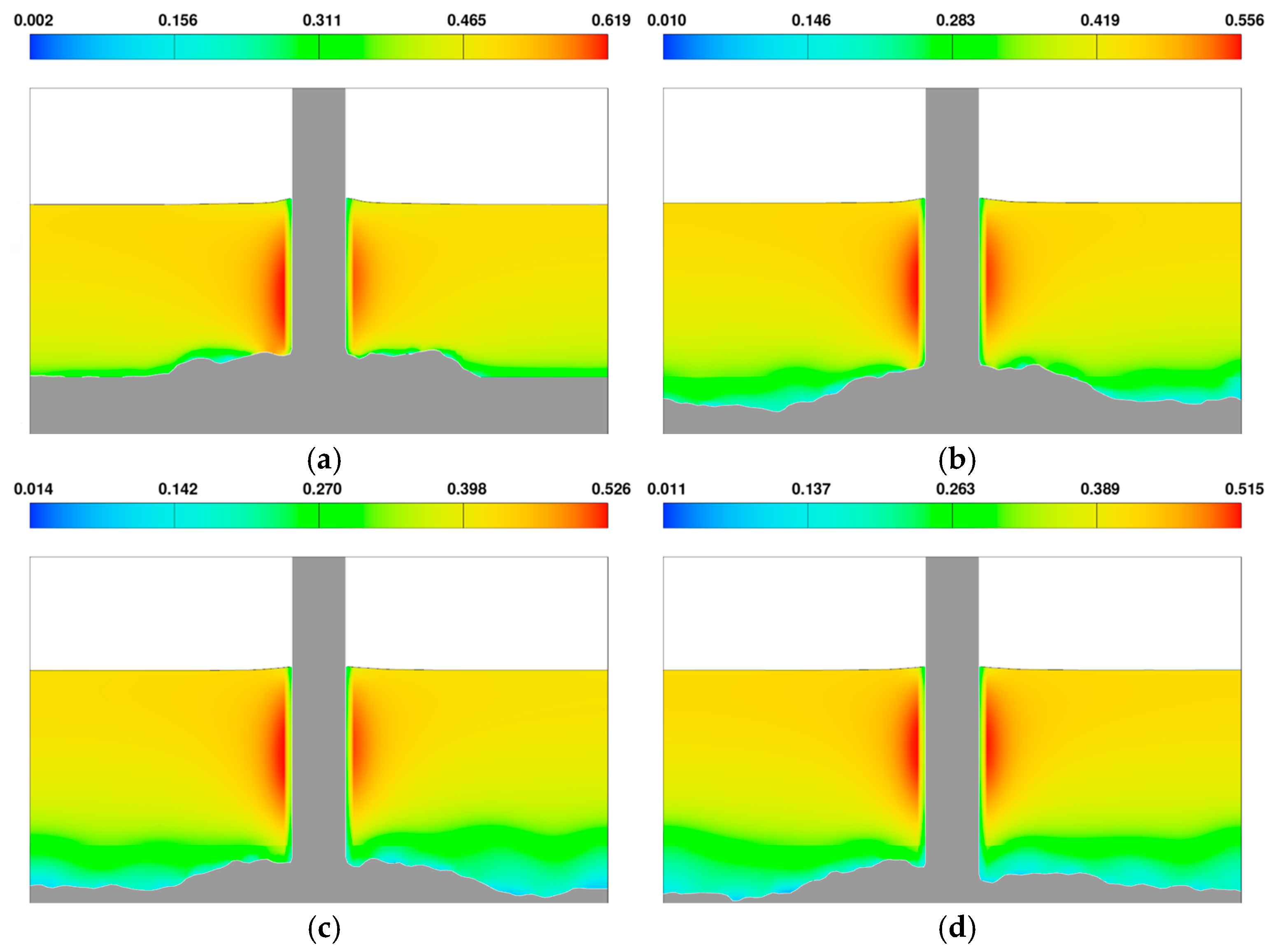 Figure 18 shows velocity contours of the X-Y section at different elevations Z under the scour of the current, where Z represents the vertical distance between the X-Y section to be observed and the seabed surface. Figure 19, Figure 20, Figure 21 and Figure 22 show the flow velocity contours of the X-Y section at different elevations Z of the riprap-protected monopile. On the whole, at the same scour stage, as Z increases and the section moves farther away from the bed surface, the maximum flow velocity around both sides of the pile foundation showed a trend of increasing first (from 0.5D to D) and then decreasing (from D to 2D). The minimum flow velocity occurs at the back of the pile foundation, reaching its maximum range at the elevation Z = 2D, which is consistent with the observations in Figure 11. Comparing Figure 18, Figure 19a, Figure 20a, Figure 21a, and Figure 22a, it can be seen that due to the formation of the riprap protection, the maximum flow velocity increased by 6.53%, 4.62%, 2.54%, and 3.42% in the range of Z = 0.5D–2D, respectively. In the fourth stage of scour, the maximum flow velocity around the protected pile foundation was reduced by 12.39%, 12.48%, 11.78%, and 10.79%, respectively, in the range of Z = 0.5D–2D.