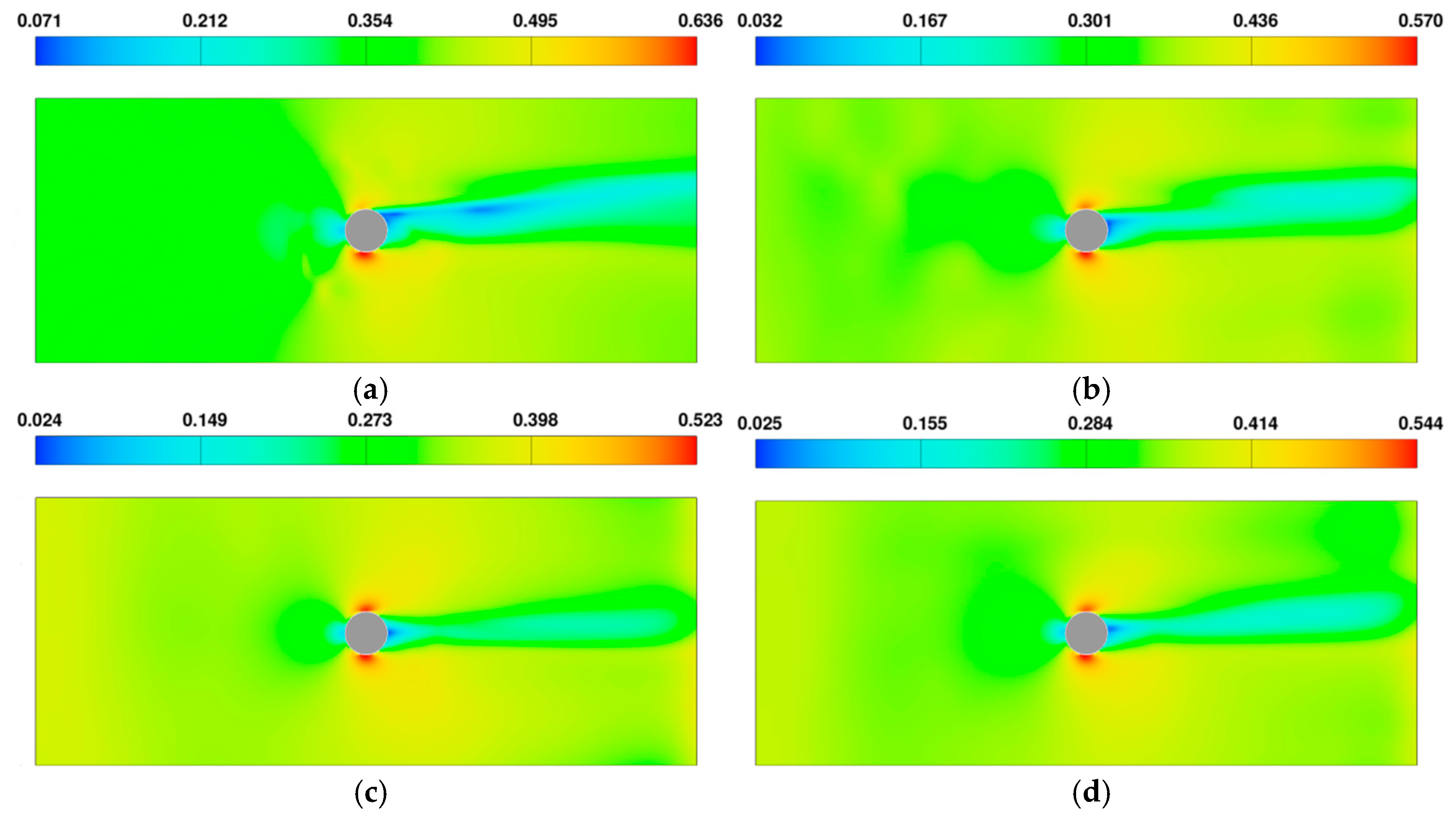 Figure 19. X-Y section velocity contour of protected pile foundation at Z = 0.5D. (a) The first stage. (b) The second stage. (c) The third stage. (d) The fourth stage.