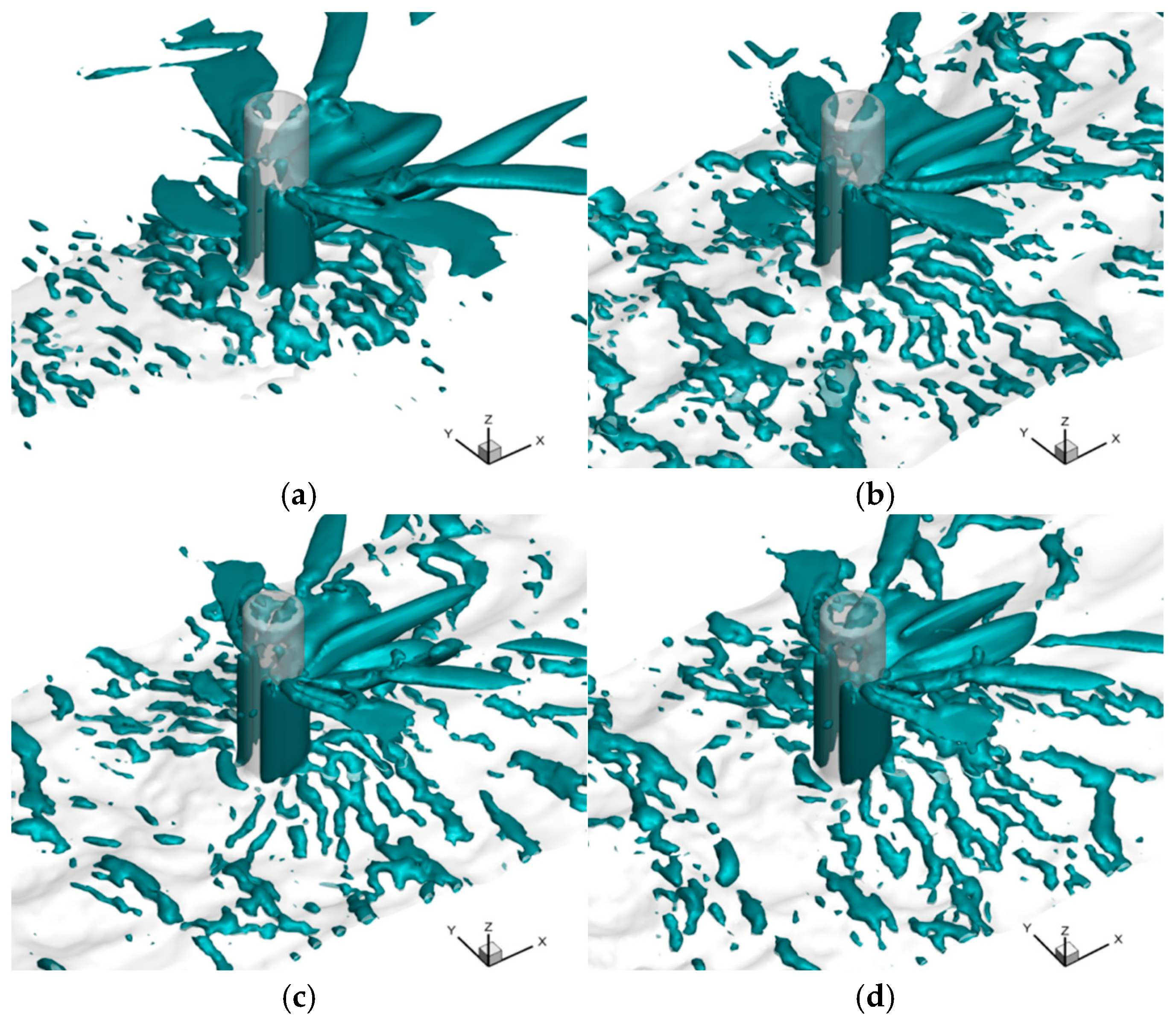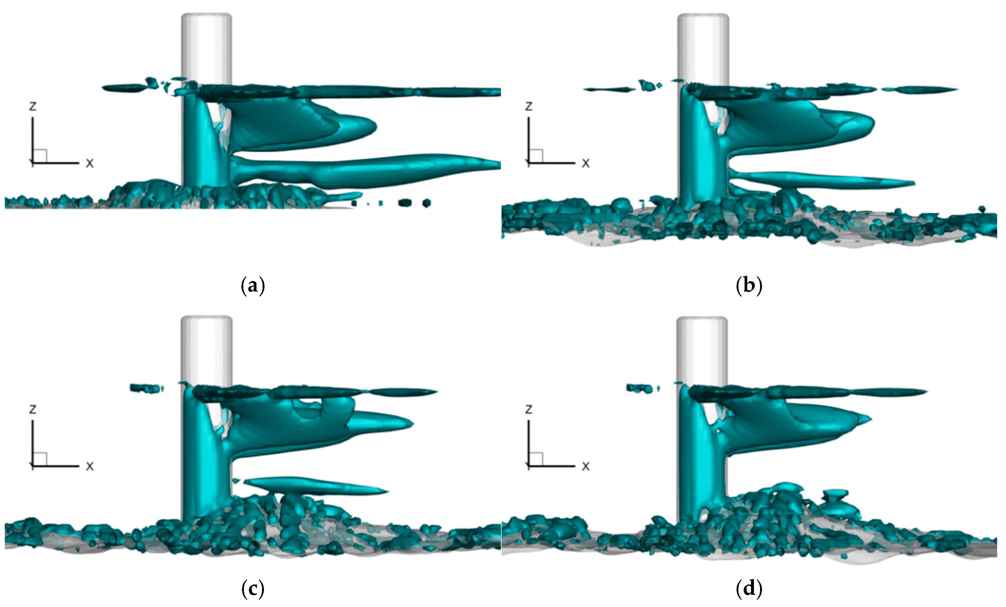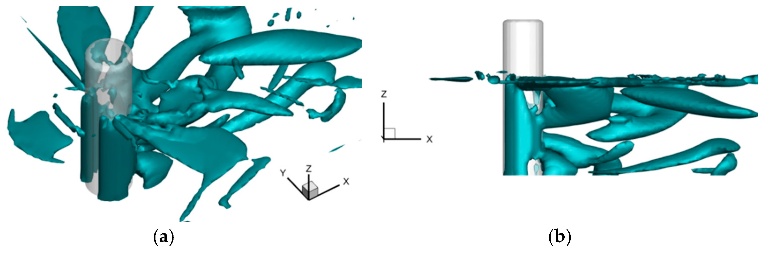 In order to show the position and strength of the horseshoe vortex before the pile foundation, the Q criterion [30] was used to identify the vortex. The expression formula of the Q criterion is as follows: