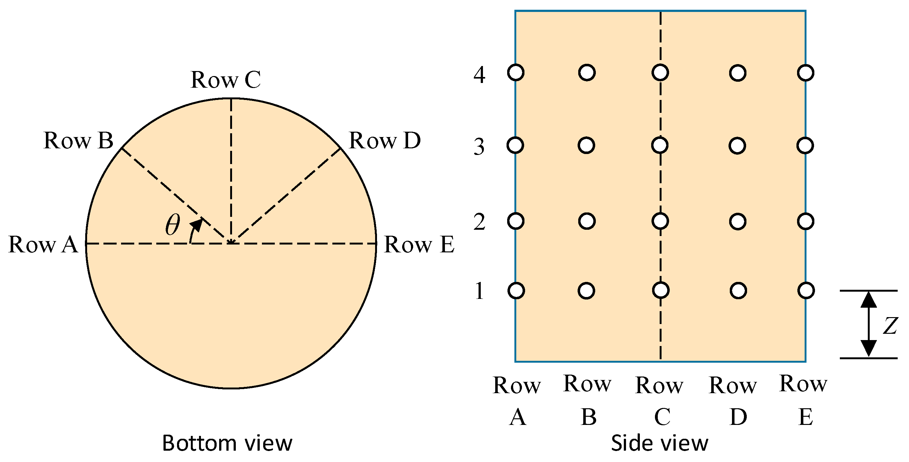 According to symmetry, only one side of the pile foundation was selected for study. Five columns of pressure sensors were evenly arranged at intervals of 45° within the range of θ = 0–180° on the side of the pile foundation. These columns were labeled as Row A, Row B, Row C, Row D, and Row E. Along the elevation direction, four pressure observation points were arranged at intervals of 0.5D for each column of sensors, where Z is defined as the vertical distance from the data recording point to the seabed surface. The specific arrangement of data recording points is shown in Figure 26 and Table 5 and Table 6.