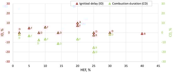 Influence of hydrogen energy fraction (HEF) on relative changes in ignition delay (ID) and combustion duration (CD) in diesel/hydrogen dual-fuel engines (A [], B [], D [], F []).