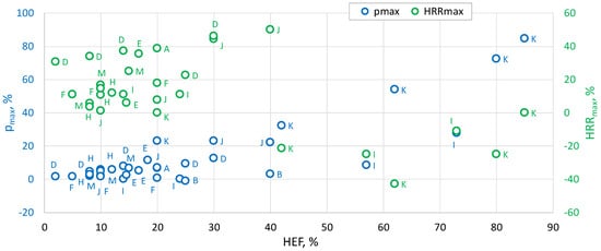 Influence of hydrogen energy fraction (HEF) on relative changes in maximum in-cylinder pressure (pmax) and maximum heat release rate (HRRmax) in diesel/hydrogen dual-fuel engines (A [], B [], D [], E [], F [], H [], I [], J [], K [], M []).