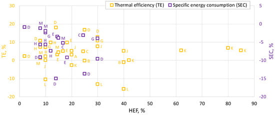 Influence of hydrogen energy fraction (HEF) on relative changes in thermal efficiency (TE) and specific energy consumption (SEC) in diesel/hydrogen dual-fuel engines (A [], B [], C [], D [], E [], G [], H [], J [], K [], L [], M []).