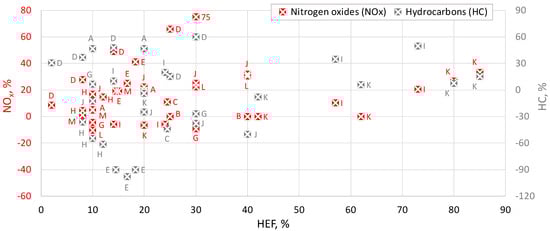 Influence of hydrogen energy fraction (HEF) on relative changes in nitrogen oxides (NOx) and hydrocarbon (HC) emissions in diesel/hydrogen dual-fuel engines (A [], B [], C [], D [], E [], G [], H [], I [], J [], K [], L [], M []).