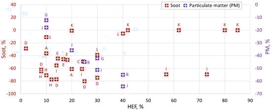 For HEF ≤ 85%, changes in Soot emissions were analyzed in 8 studies, and changes in particulate matter (PM) emissions were analyzed in 3 studies. All indicated a reduction in emissions of these species from diesel/hydrogen dual-fuel engines.