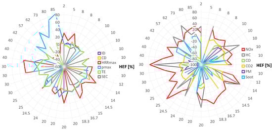 Table 4 presents the relative percentage changes of selected parameters of diesel/hydrogen dual-fuel engines with respect to a reference fuel, i.e., diesel. The table illustrates the effect of the hydrogen energy fraction (HEF) in the range of 2–85% on key indicators relevant to the operation of an internal combustion engine, such as ignition delay (ID), combustion duration (CD), maximum in-cylinder pressure (pmax), maximum heat release rate (HRRmax), thermal efficiency (TE), specific energy consumption (SEC), coefficient of variation of indicated mean effective pressure (COVimep), coefficient of variation of maximum in-cylinder pressure (COVpmax), nitrogen oxides (NOx), hydrocarbons (HC), carbon monoxide (CO), carbon dioxide (CO2), Soot, and particulate matter (PM) emissions.