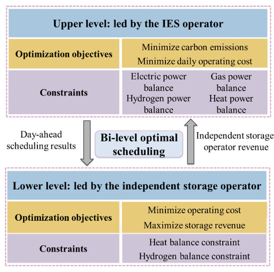 In summary, this paper proposes a bi-level optimal model for the independent scheduling of HES, under the overarching goal of enabling low-carbon operation in IES. The model decouples electrical, thermal, and hydrogen energy storage from the internal structure of the IES and treats them as independent market entities with autonomous decision-making capabilities. The proposed hybrid storage configuration model consists of two hierarchical levels: The upper-level model, governed by the IES operator, aims to minimise the total system operating cost, considering factors such as energy procurement, carbon trading, renewable curtailment penalties, CCS costs, and DR compensation. The lower-level model, led by independent storage operators, aims to maximise net profit by evaluating investment returns and market price signals (electricity, heat, etc.), thereby enabling profit-driven decision-making by storage service providers. The interaction between the two layers is mediated through price and energy signals, forming a bi-level optimal framework with Stackelberg game characteristics. This structure facilitates efficient coordination between system-wide low-carbon objectives and localised profitability targets.