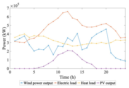 Using operational data from a large-scale industrial park IES as an example, the scheduling cycle T is set to 24 h. The forecasted output curves of renewable generation (wind and PV) and the electricity/heat load demand profiles are shown in Figure 4. The parameters of all equipment and models are presented in Table 2.