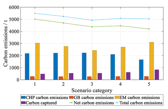 To quantify the carbon emission control effects across different scenarios, Figure 5 presents the carbon emissions from major energy equipment, carbon capture volumes, and the total system carbon emissions under the five operational scenarios described above.